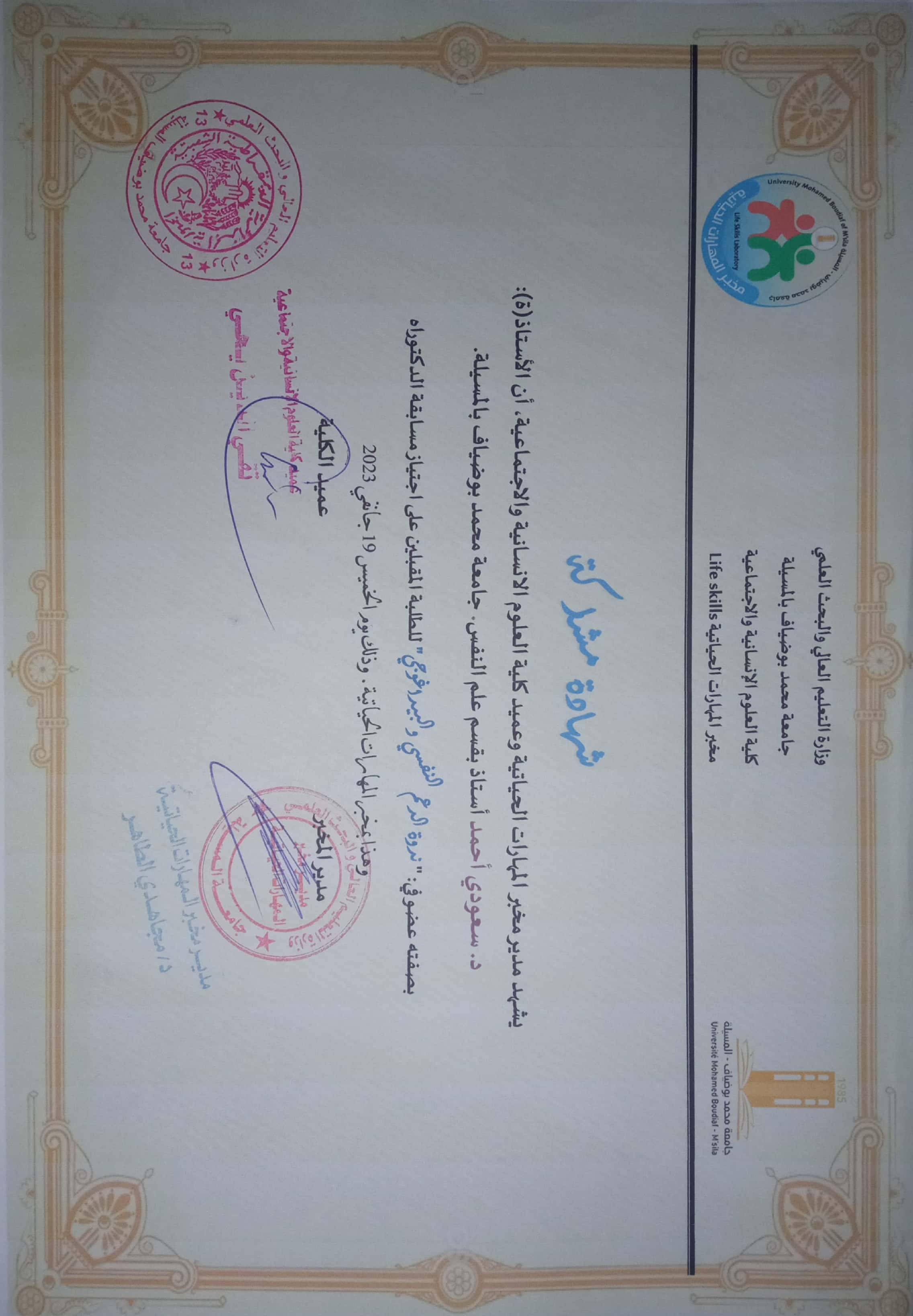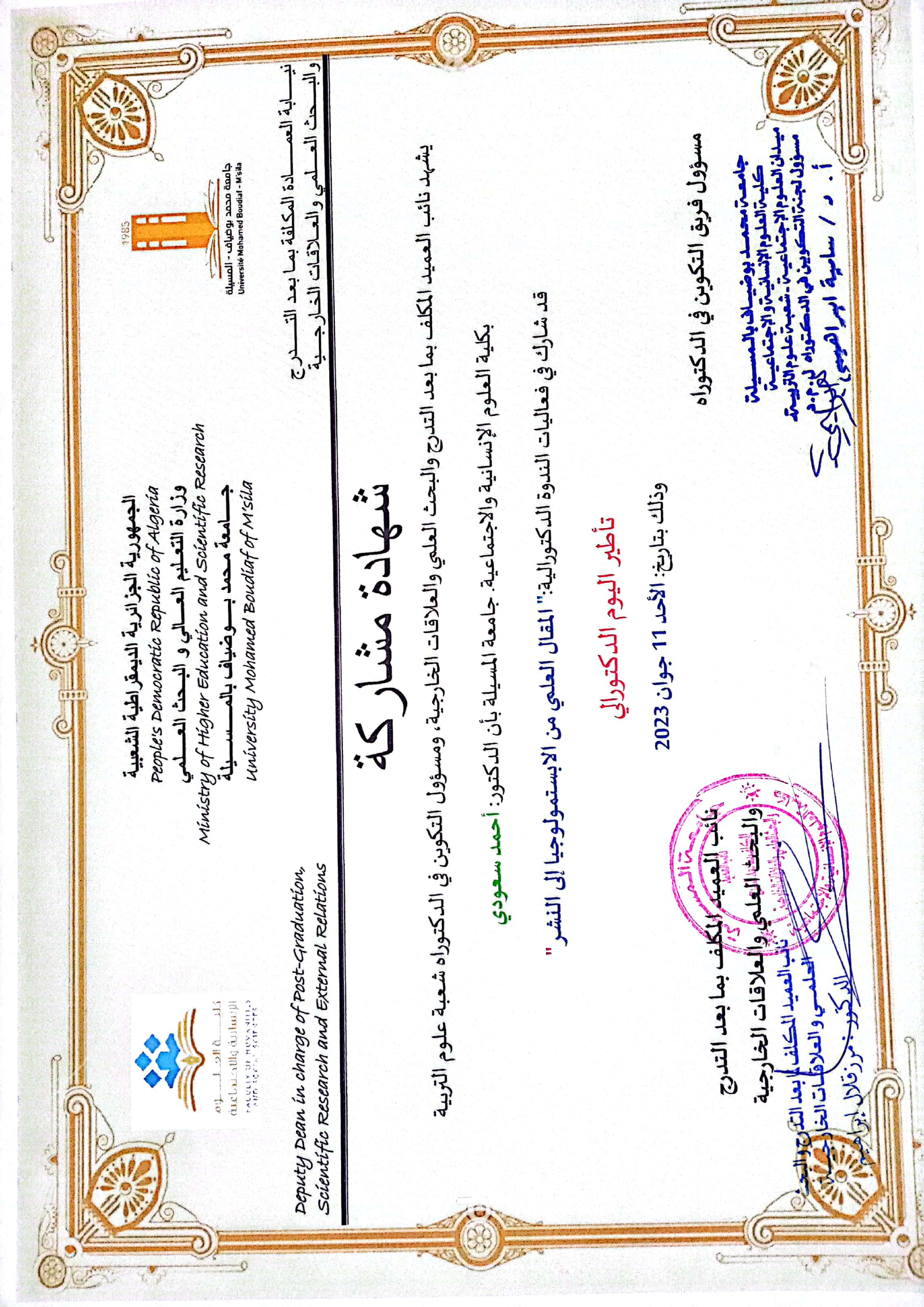 M. SAOUDI Ahmed, (2023), "كيف أعد إجابة متميزة في مسابقة الدكتوراه", [national] ندوة الدعم النفسي والبيداغوجي للطلبة المقبلين على اجتياز مسابقة الدكتوراه , مخبر المهارات الحياتية، جامعة المسيلة