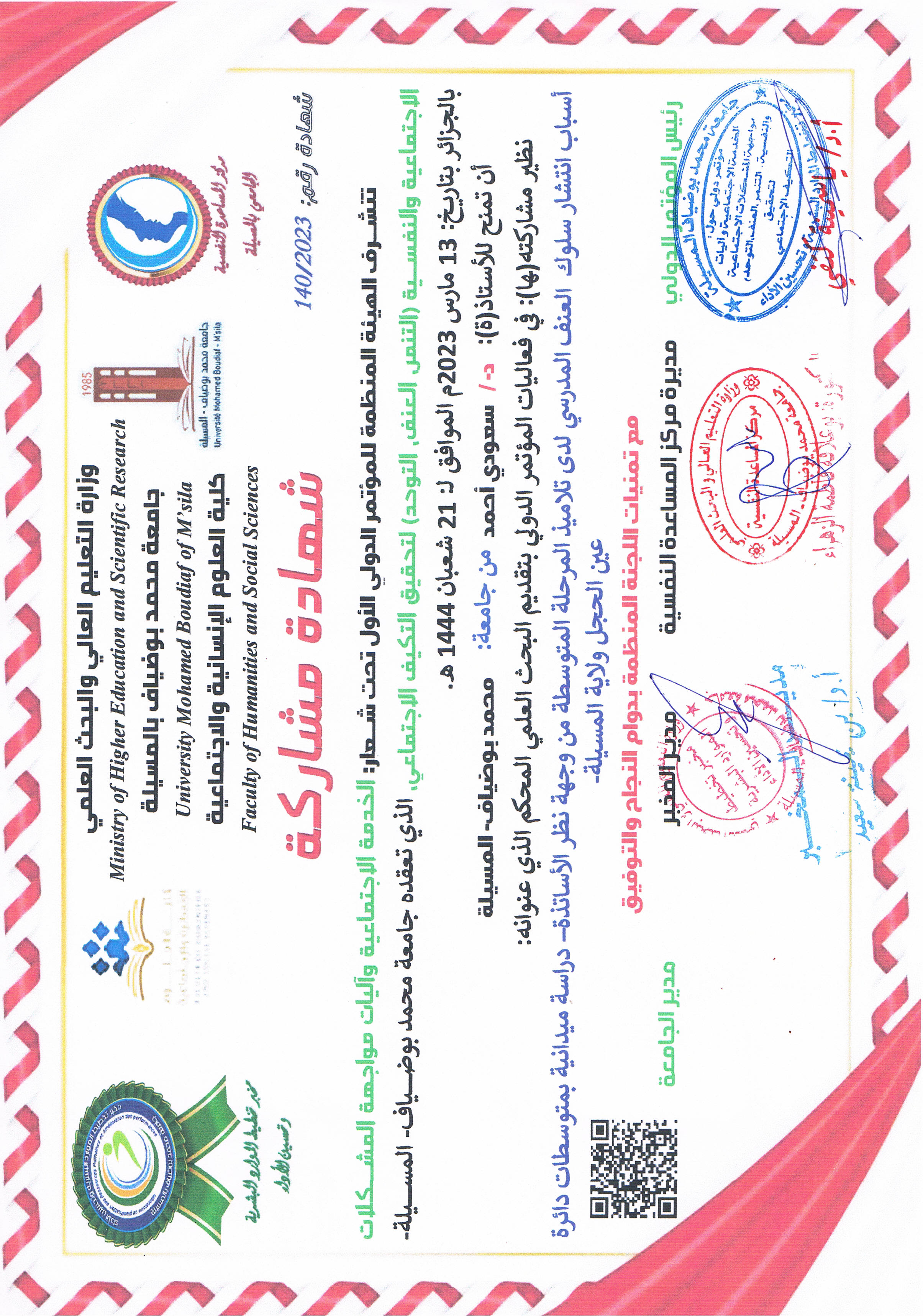 M. SAOUDI Ahmed, (2013-03-13), "أسباب انتشار سلوك العنف المدرسي لدى تلاميذ المرحلة المتوسطة", [international] لمؤتمر الدولي الخدمة الاجتماعية وآليات مواجهة المشكلات الاجتماعية والنفسية (التنمر، العنف التوحد) لتحقيق التكيف الاجتماعياا , جامعة المسيلة