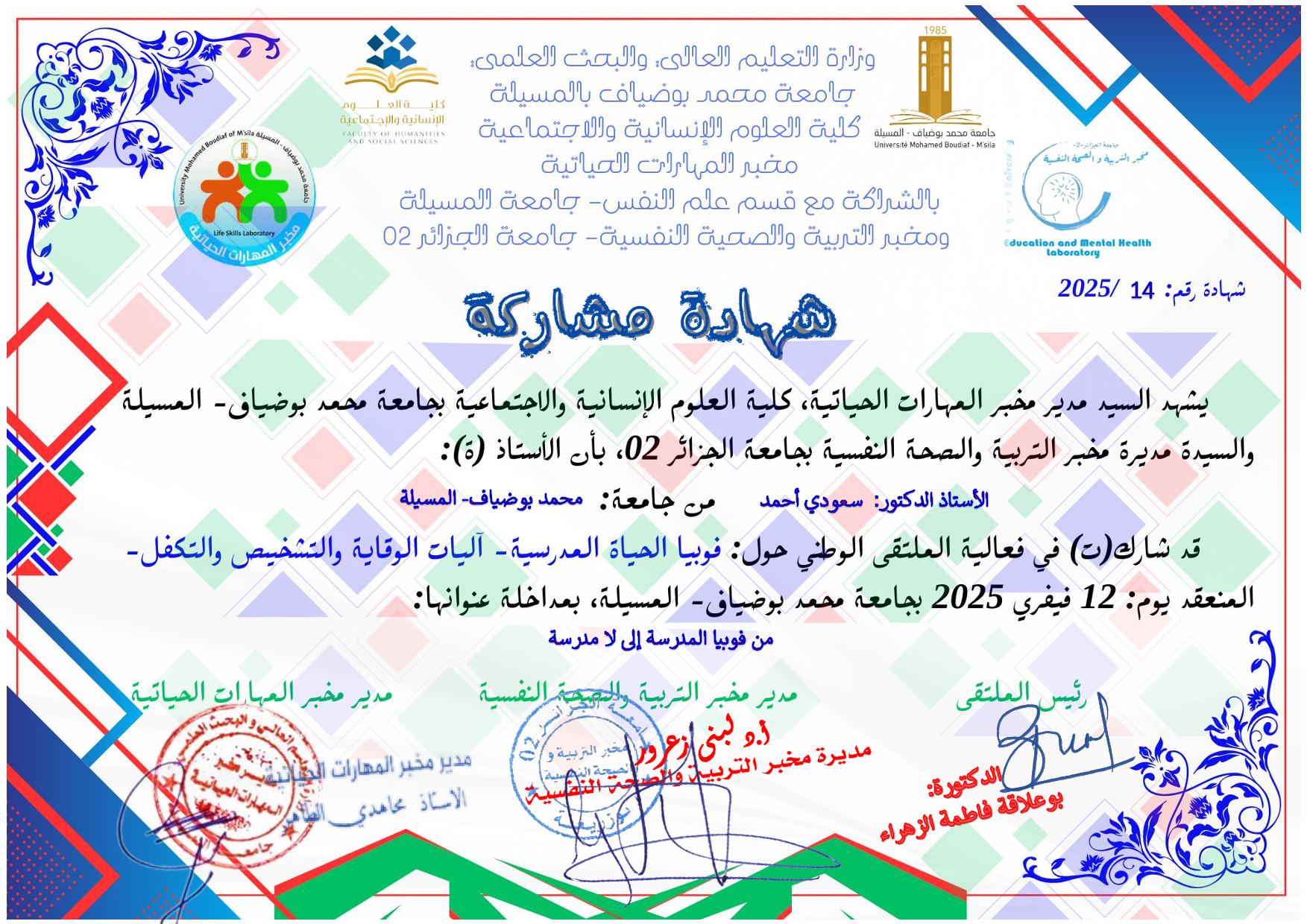 M. SAOUDI Ahmed, (2025-02-12), "من فوبيا المدرسة إلى اللامدرسة", [national] فوبيا الحياة المدرسية , جامعة المسيلة