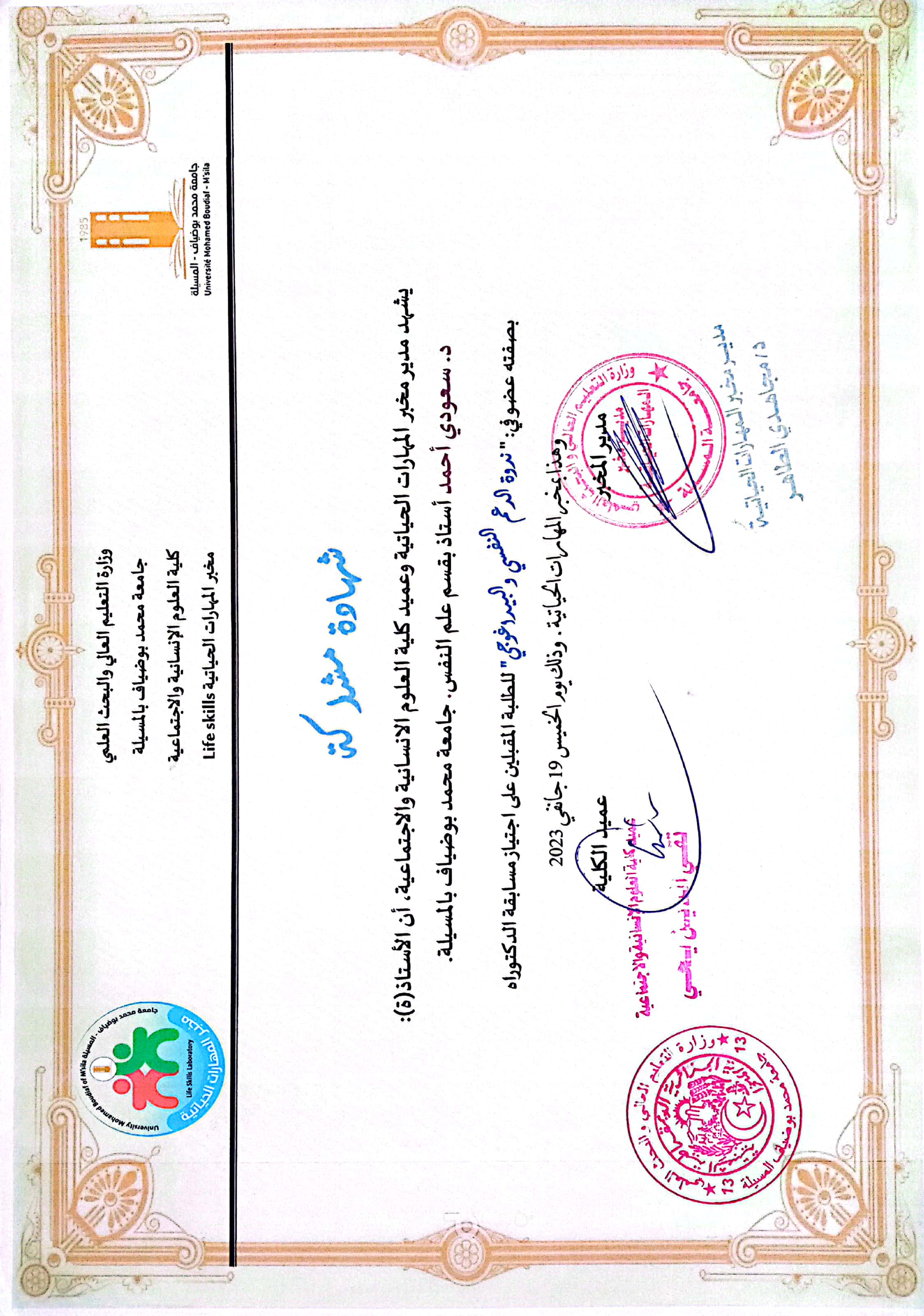 M. SAOUDI Ahmed, (2023-01-19), "الدعم النفسي والبيداغوجي للطلبة المقبلين على الدكتوراه", [national] الندوة الوطنية للطلبة المقبلين على الدكتوراه , جامعة المسيلة