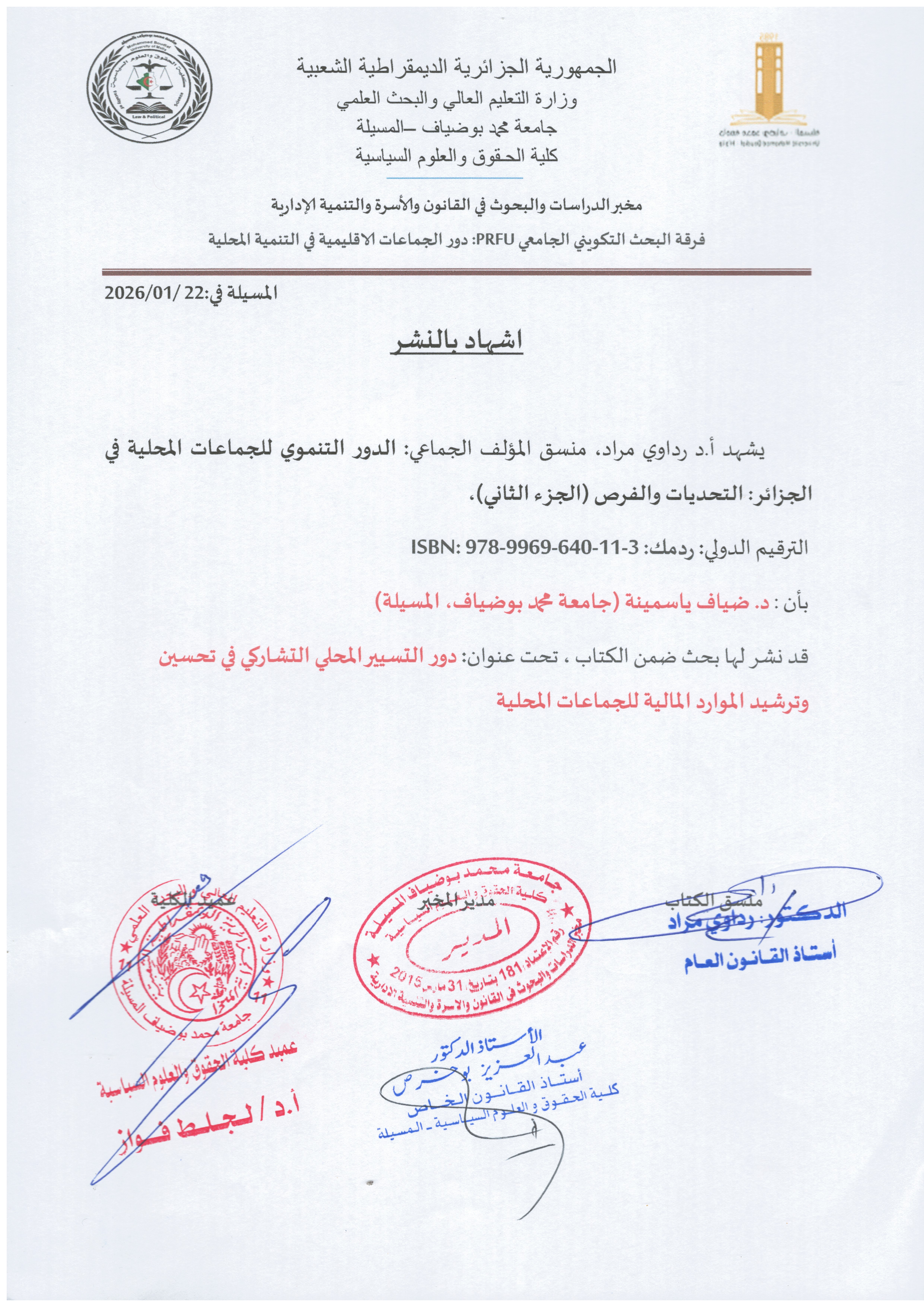 M. DIAF Yassamina, (2026-01-22), "دور التسيير المحلي التشاركي في تحسين وترشيد الموارد المالية للجماعات المحلية", [national] الدور التنموي للجماعات المحلية في الجزائر: التحديات والفرص (الجزء الثاني) , ضياف ياسمينة
