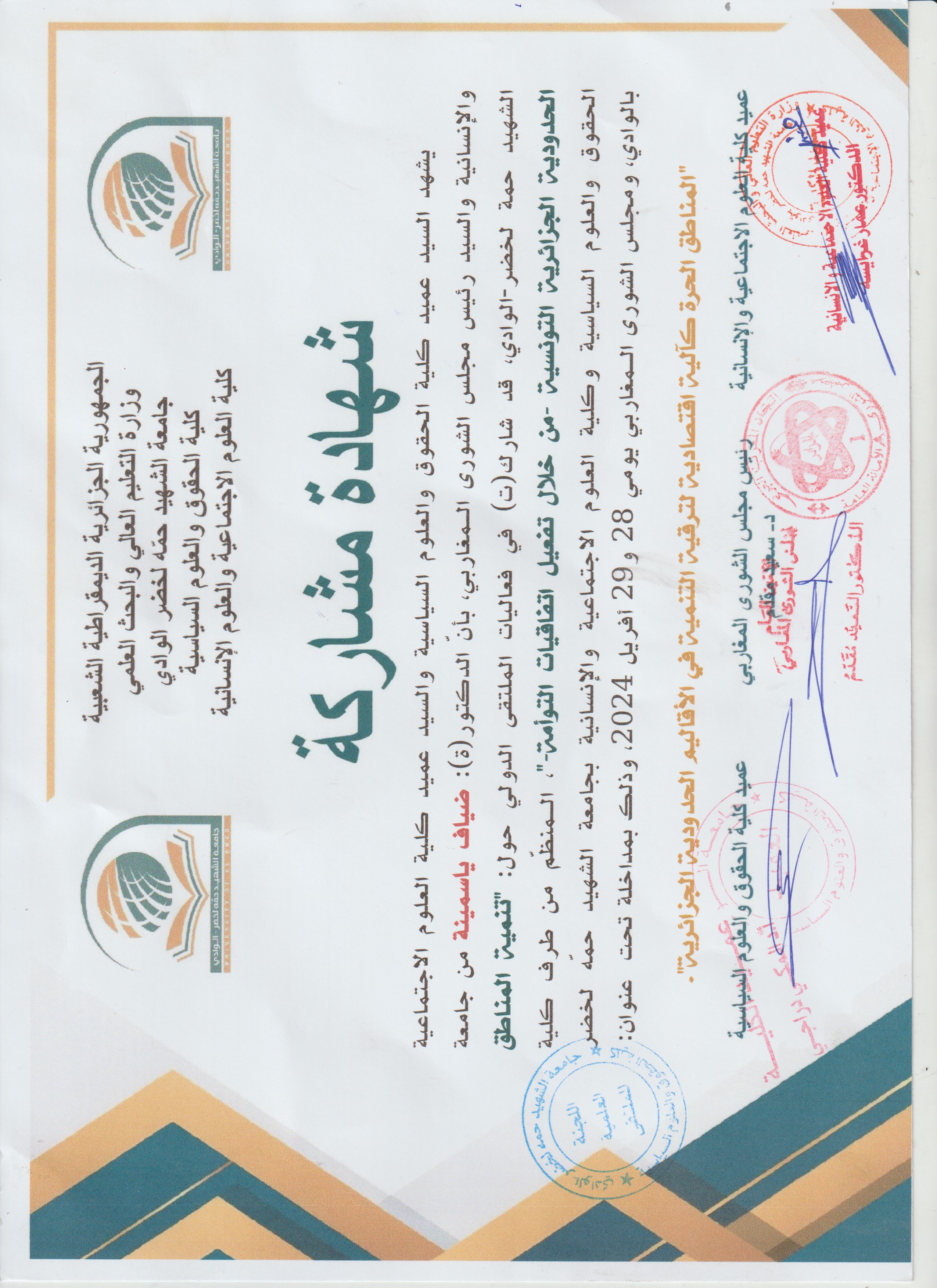 M. DIAF Yassamina, (2024-04-29), "المناطق الحرة كآلية اقتصادية لترقية التنمية في الأقاليم الحدودية الجزائرية", [international] تنمية المناطق الحدودية الجزائرية التونسية من خلال تفعيل إتفاقيات التوأمة , كلية الحقوق والعلوم السياسية جامعة الوادي