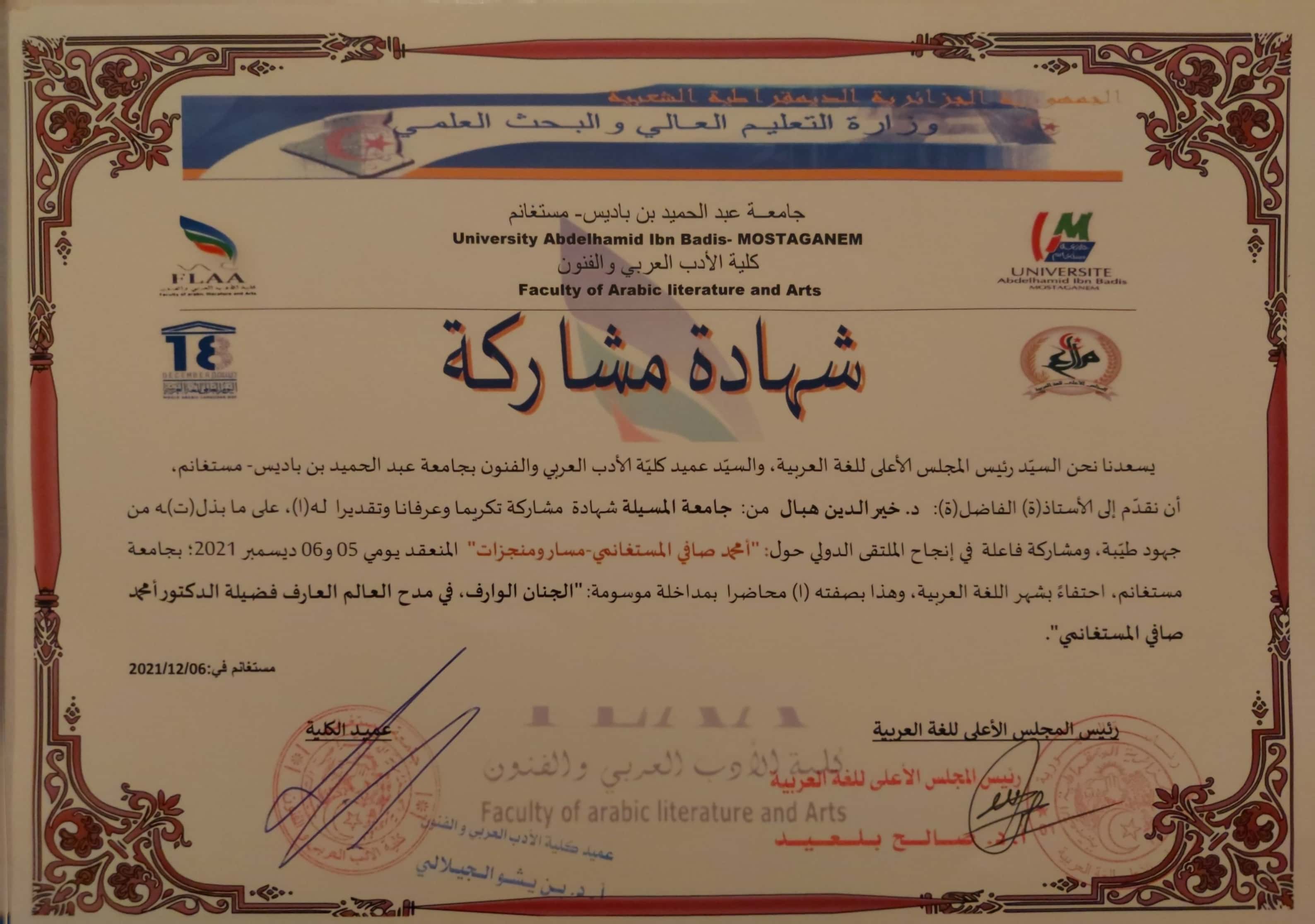M. KHEIREDDINE Hebal, (2021), "الجنان الوارف في مدح العالم العارف؛ فضيلة الدّكتور: امحمّد صافي المستغانمي", [international] امحمّد صافي المستغانمي؛ مسار ومنجزات , -جاامعة عبد الحميد بن باديس -مستغانم
