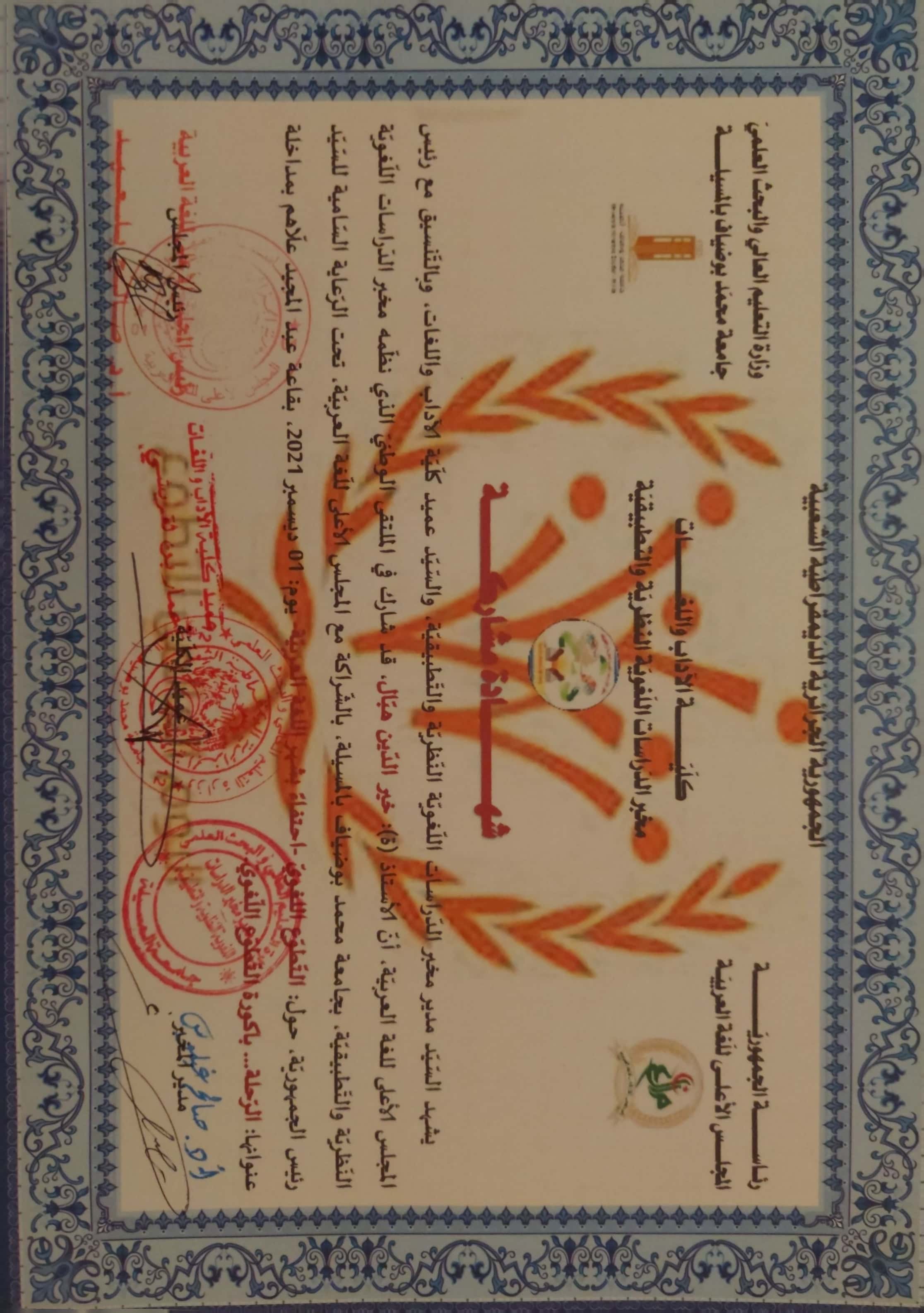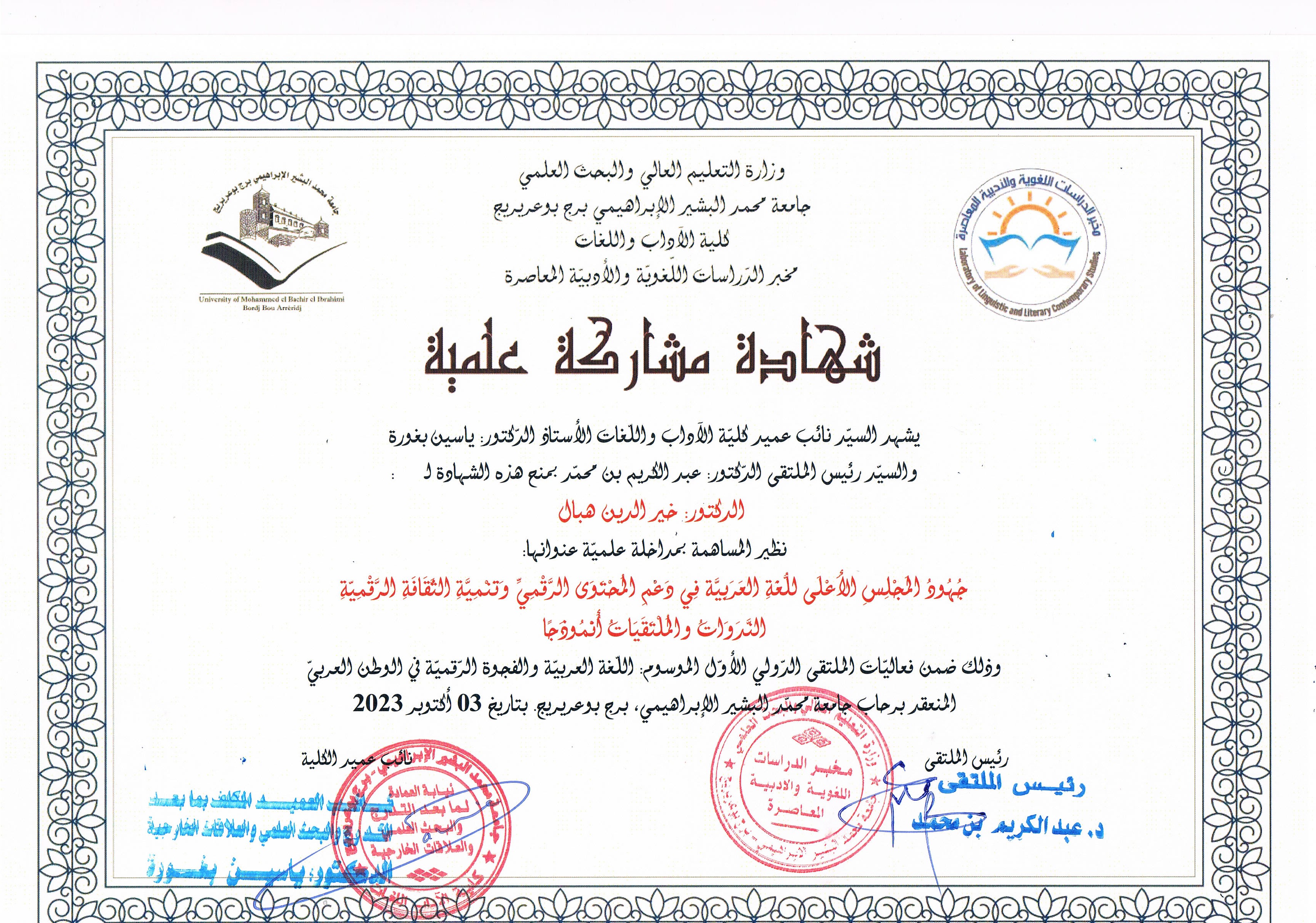 M. KHEIREDDINE Hebal, (2023), "دور العربيّة في تطوير العلوم العقلية والنقليّة في الشّرق والغرب", [national] مساهمة اللّغة العربيّة في الحضارة والثّقافة الإنسانيّة , قاعة المحاضرات ببلديّة برهوم، ولاية المسيلة