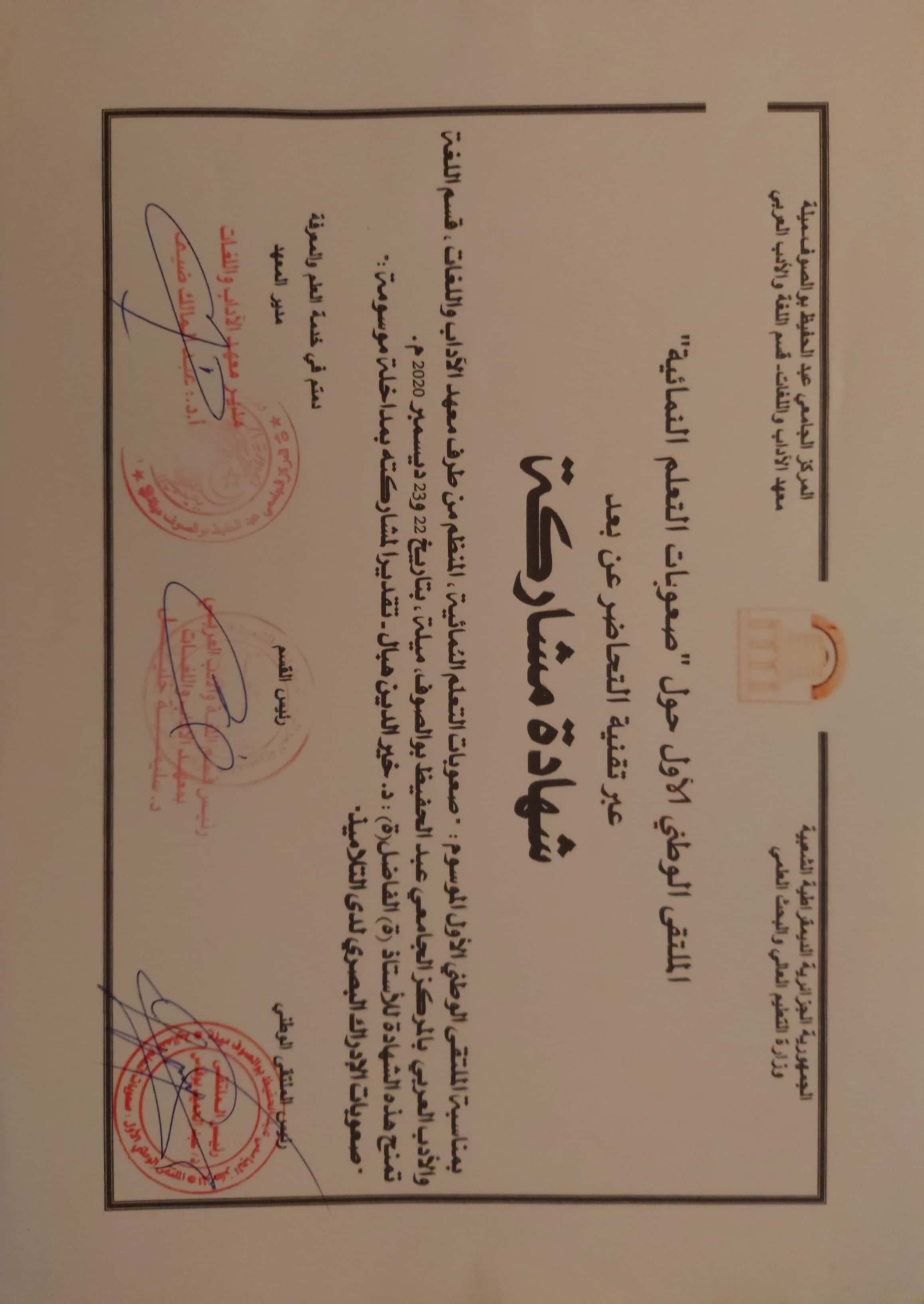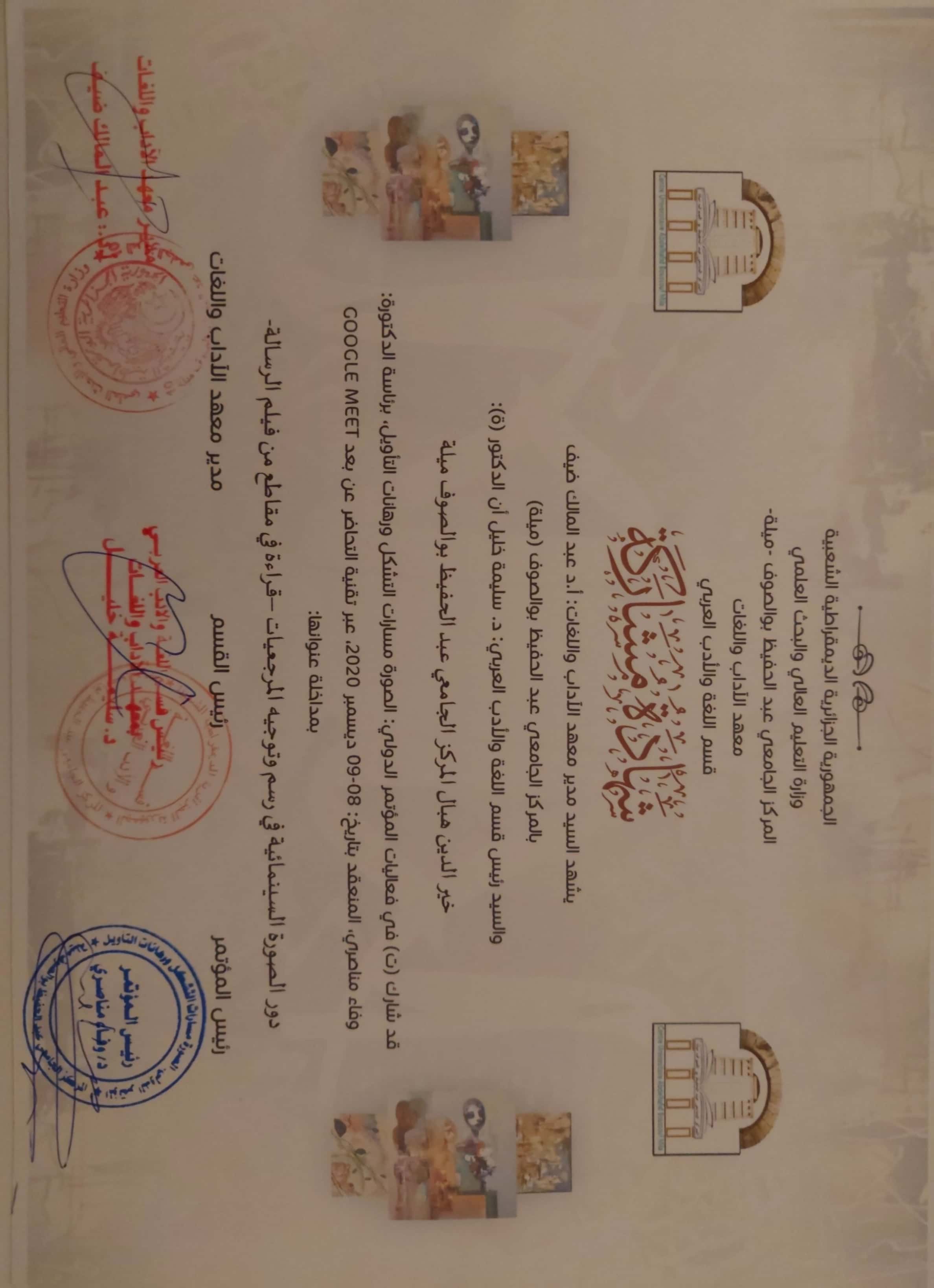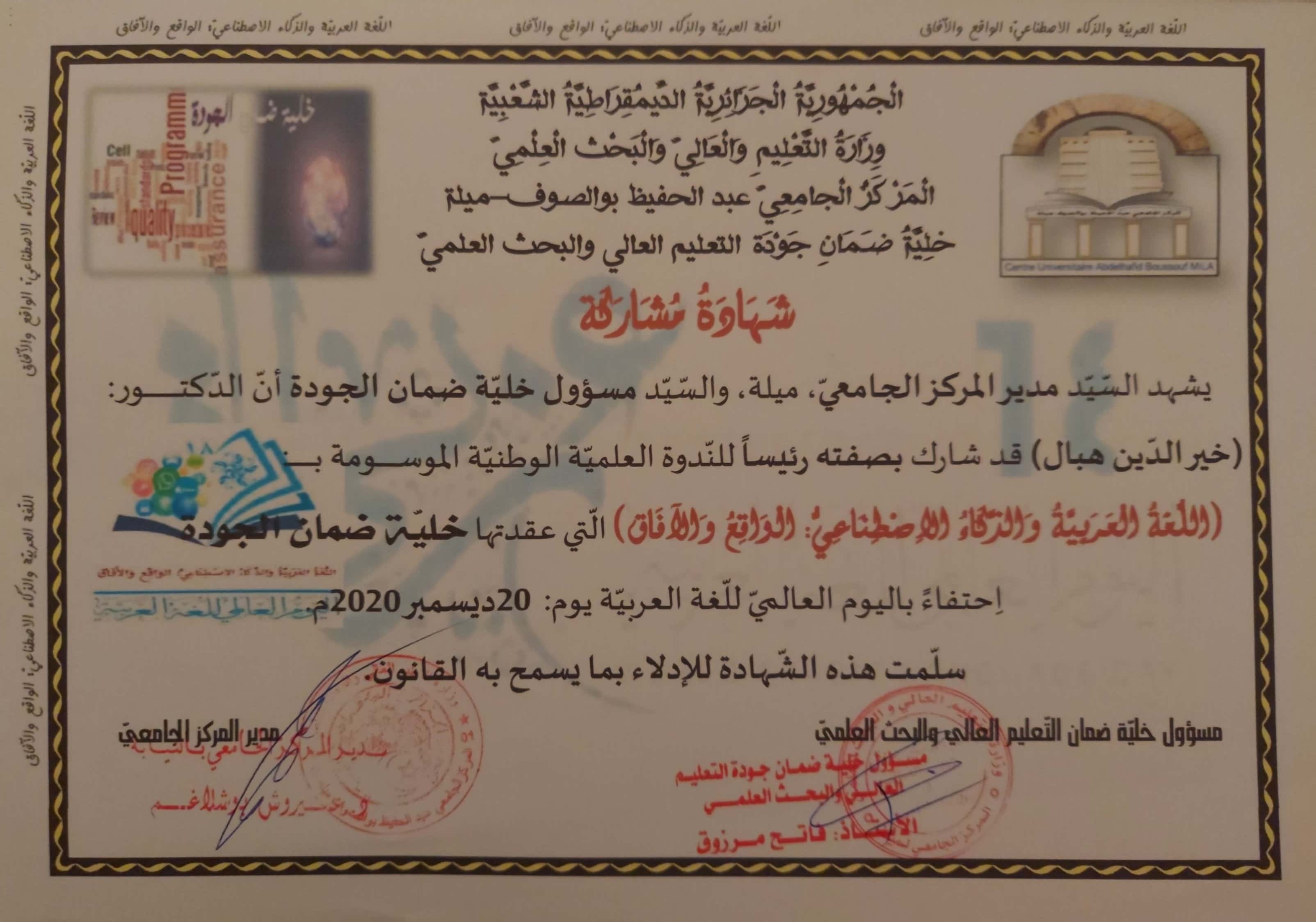 M. KHEIREDDINE Hebal, (2020), "رئيس النّدوة العلمية", [national] اللّغة العربية والذّكاء الاصطناعي؛ الواقع والآفاق , -المركز الجامعيّ عبد الحفيظ بوالصّوف -ميلة