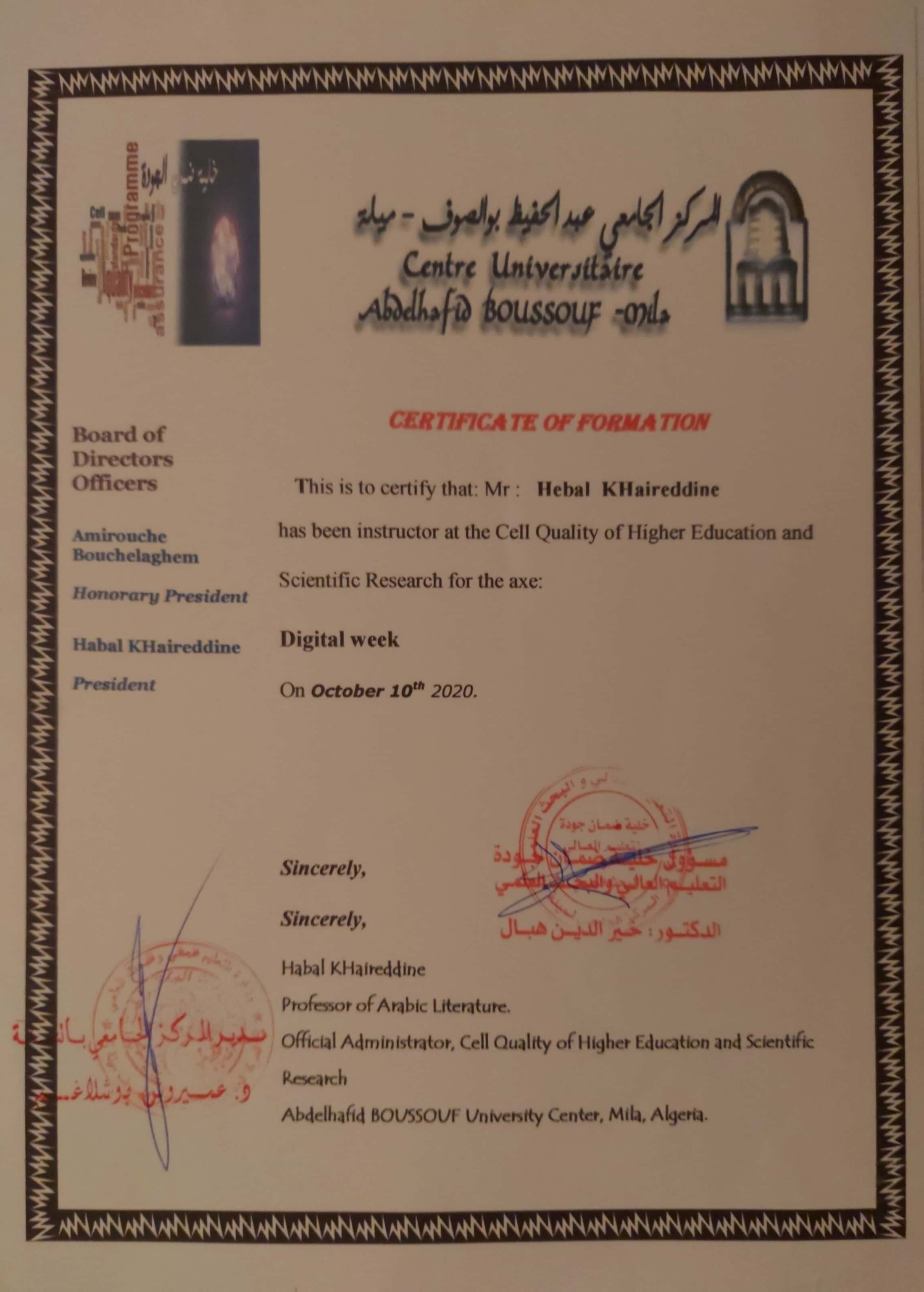 M. KHEIREDDINE Hebal, (2020), ""الأسبوع الرّقمي للأساتذة حديثي التوظيف "استعمال منصّة مودل", [national] -المركز الجامعي عبد الحفيظ بوالصوف -ميلة