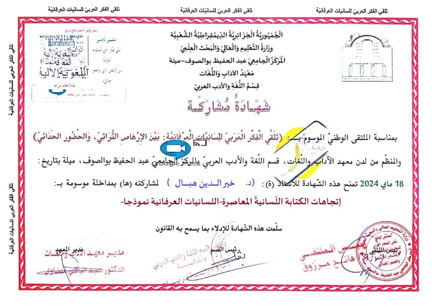 M. KHEIREDDINE Hebal, (2024-05-18), "اتّجاهات الكتابة اللّسانية المعاصرة -اللّسانيات العرفانية أنموذجا-", [national] تلقّي الفكر العربي للّسانيّات العرفانية بين الإرهاص التراثي والحضور الحداثي , المركز الجامعي عبد الحفيظ بوالصوف -ميلة-