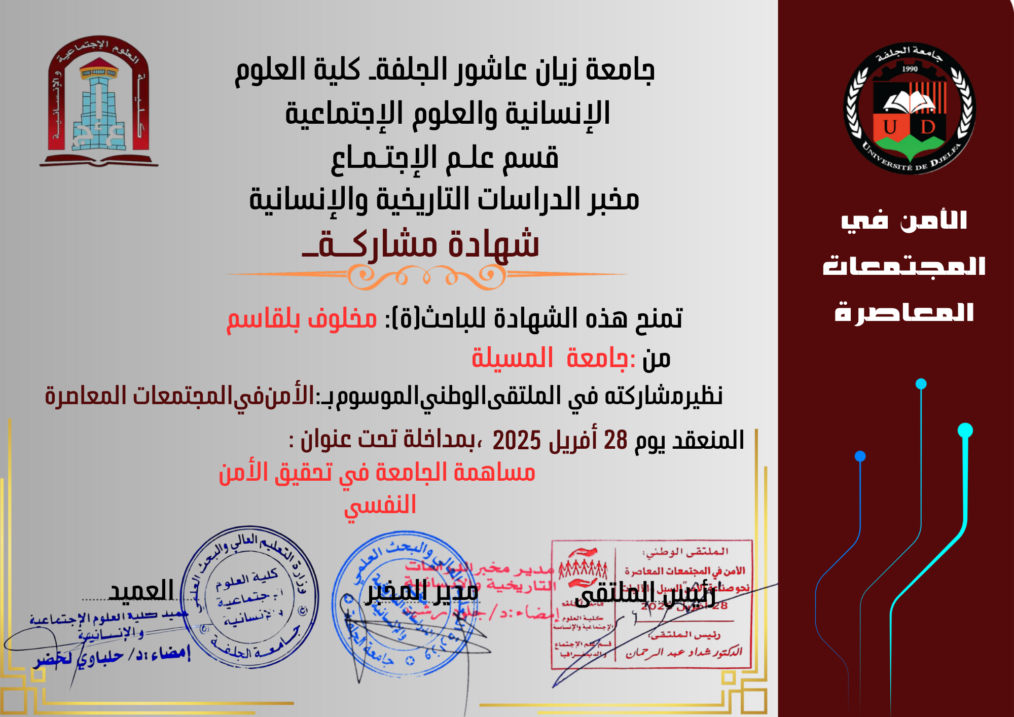 M. MAKHLOUF Belkacem, (2025-04-28), "الأمن في المجتمعات المعاصرة", [national] مساهمة الجامعة في تحقيق الأمن النفسي , جامعة الجلفة