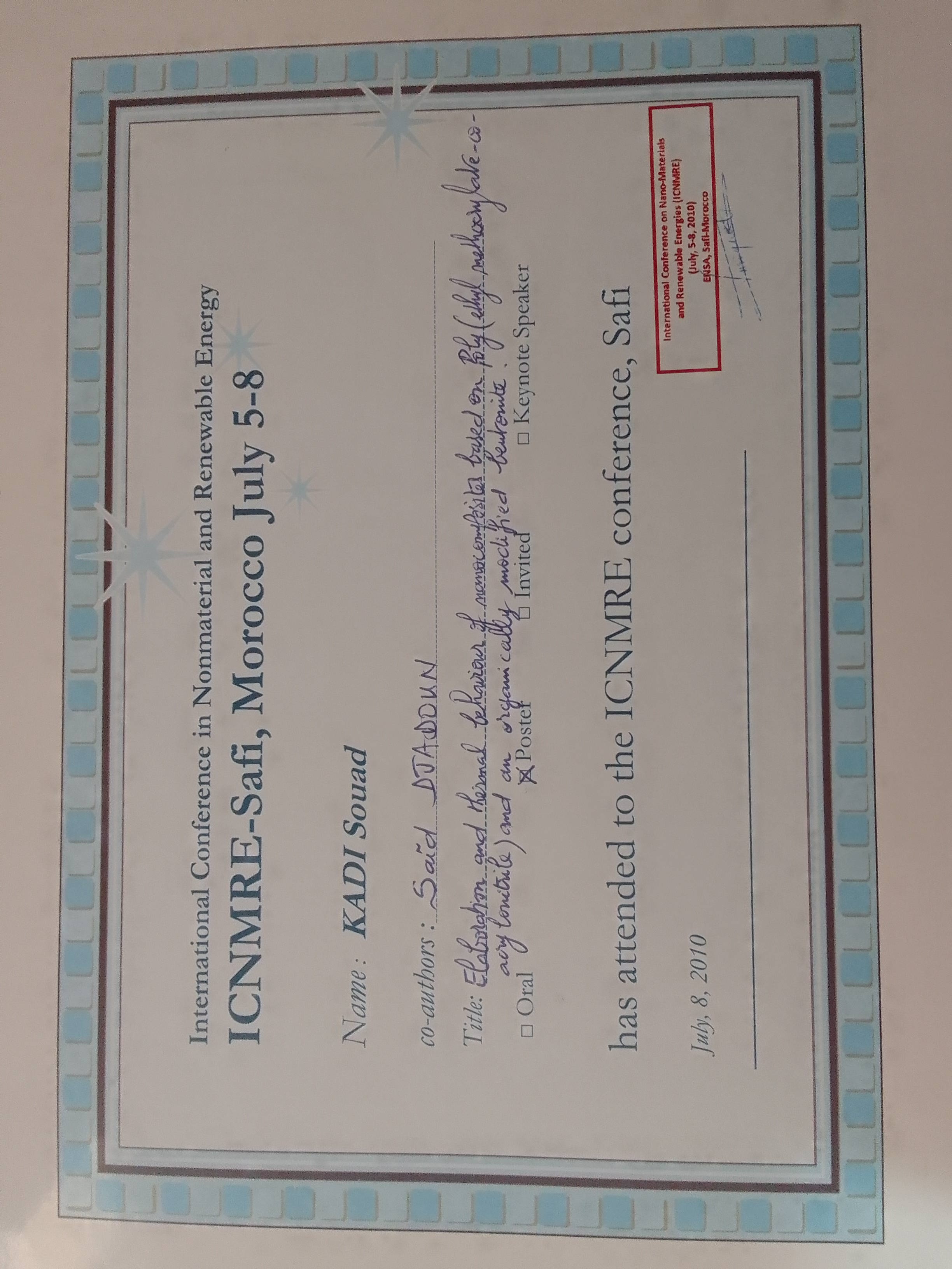 M. KADI Souad, (2010), "Elaboration and thermal bihaviour of nanocomposites based on poly (ethyl methacrylate–co-acrylonitrile) and an organically modified bentonite", [international] International Conference in Nanomaterial and Renewable Energy ICNMRE-Safi, Morocco , Safi, Morocco