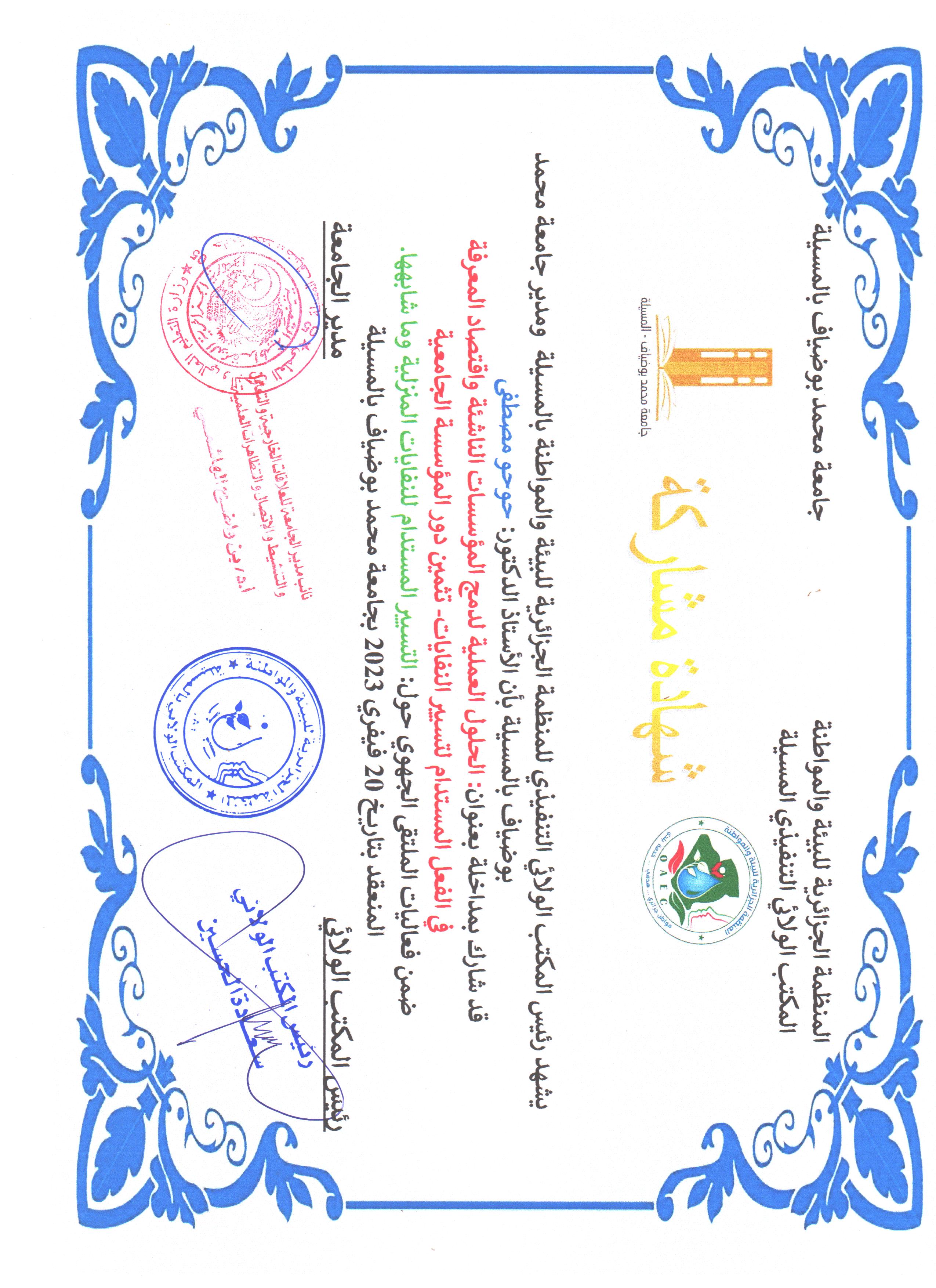M. HOUHOU Mustapha, (2023), "الحلول العملية لدمج المؤسسات الناشئة واقتصاد المعرفة في الفعل المستدام لتسيير النفايات – تثمين دور المؤسسة الجامعية-", [national] التسيير المستدام للنفايات المنزلية وما شابهها , جامعة المسيلة