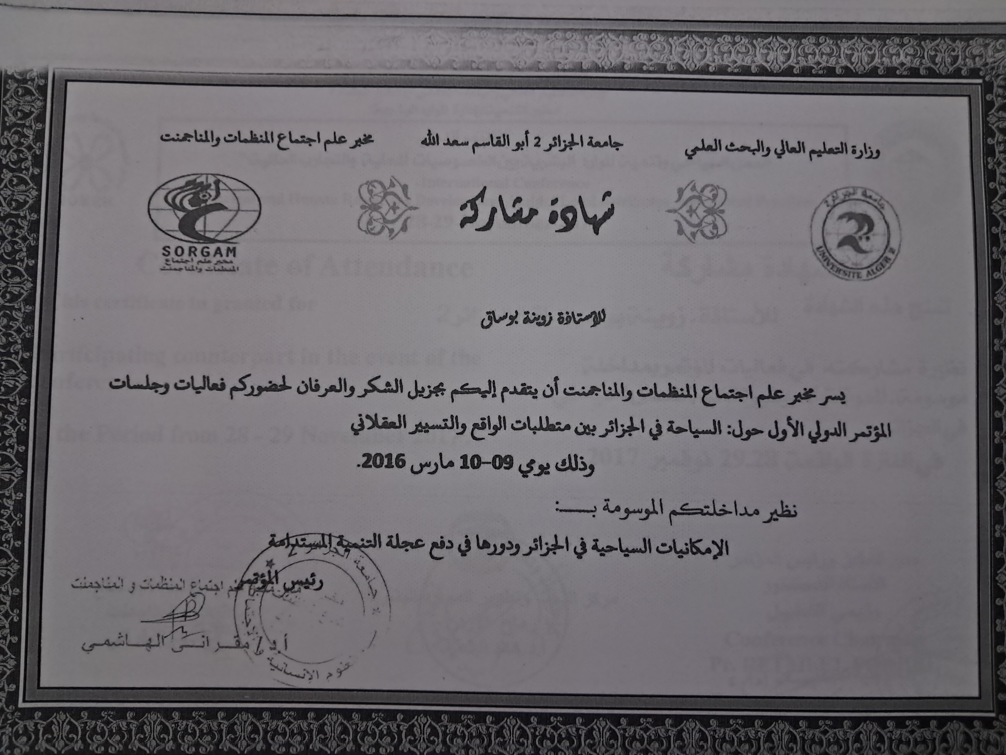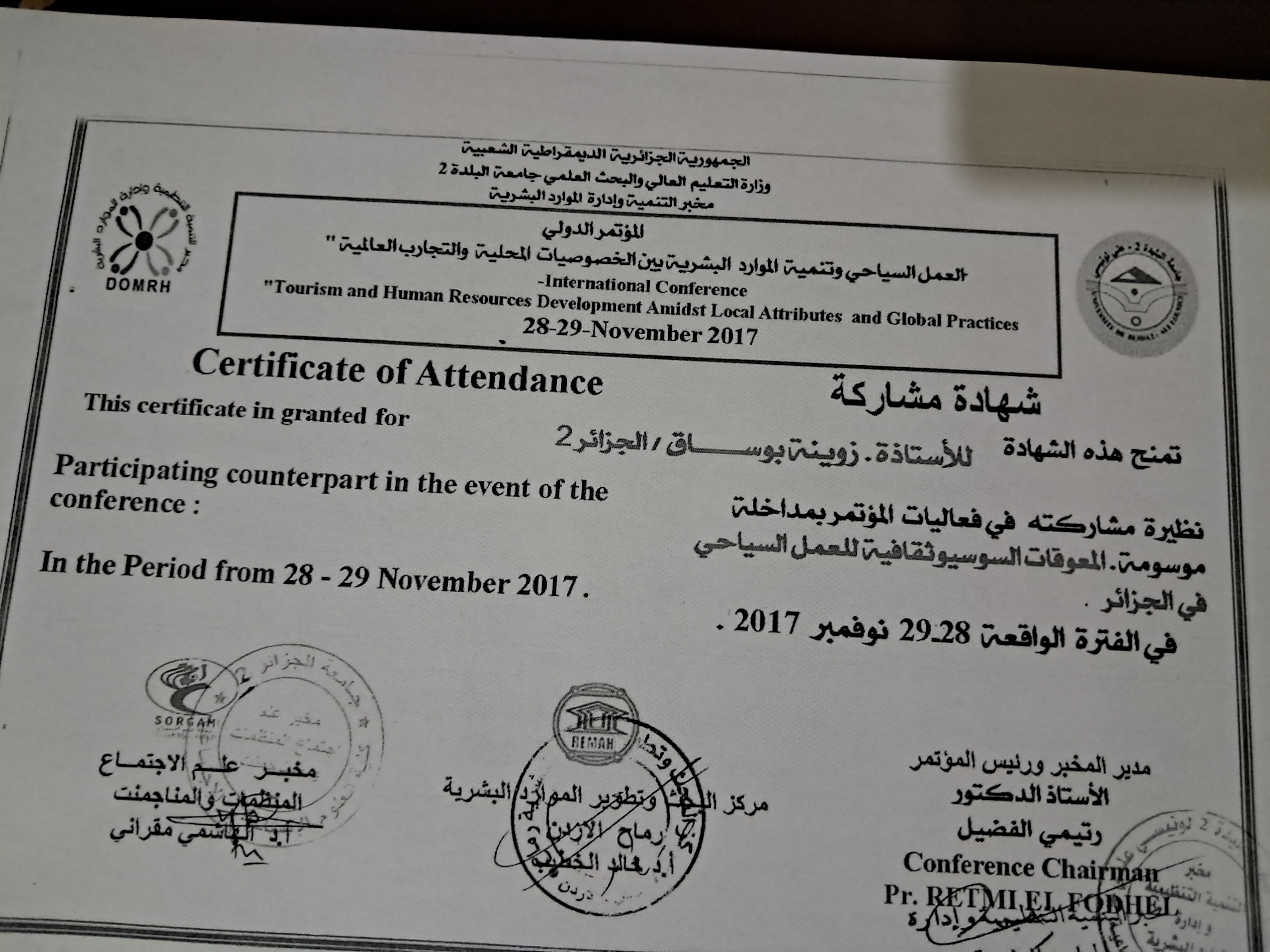 M. BOUSSAG Zouina, (2017-11-28), "المعوقات السوسيوثقافية للعمل السياحي في الجزائر ة", [international] المؤتمر الدولي العمل السياحي وتنمية الموارد البشرية بين الخصوصيات المحلية والتجارب العملية ني , الجزائر.جامعة الجزائر 2