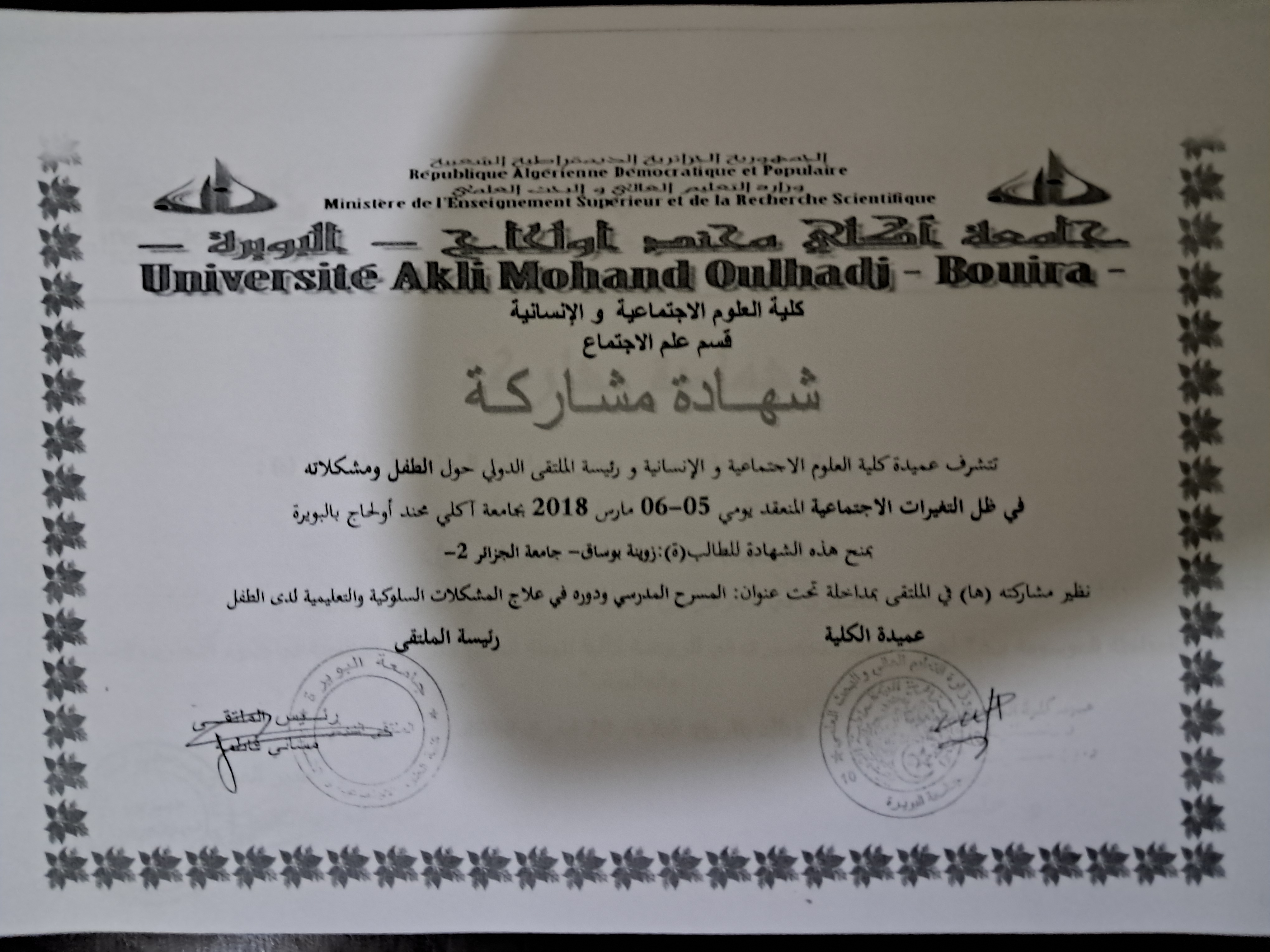 M. BOUSSAG Zouina, (2018-03-05), "المسرح المدرسي ودوره في علاج المشكلات السلوكية والتعليمية لدى الطفل", [international] الملتقى الدولي حول الطفل ومشكلته في ظل التغيرات الاجتماعية , البويرة.جامعة البويرة