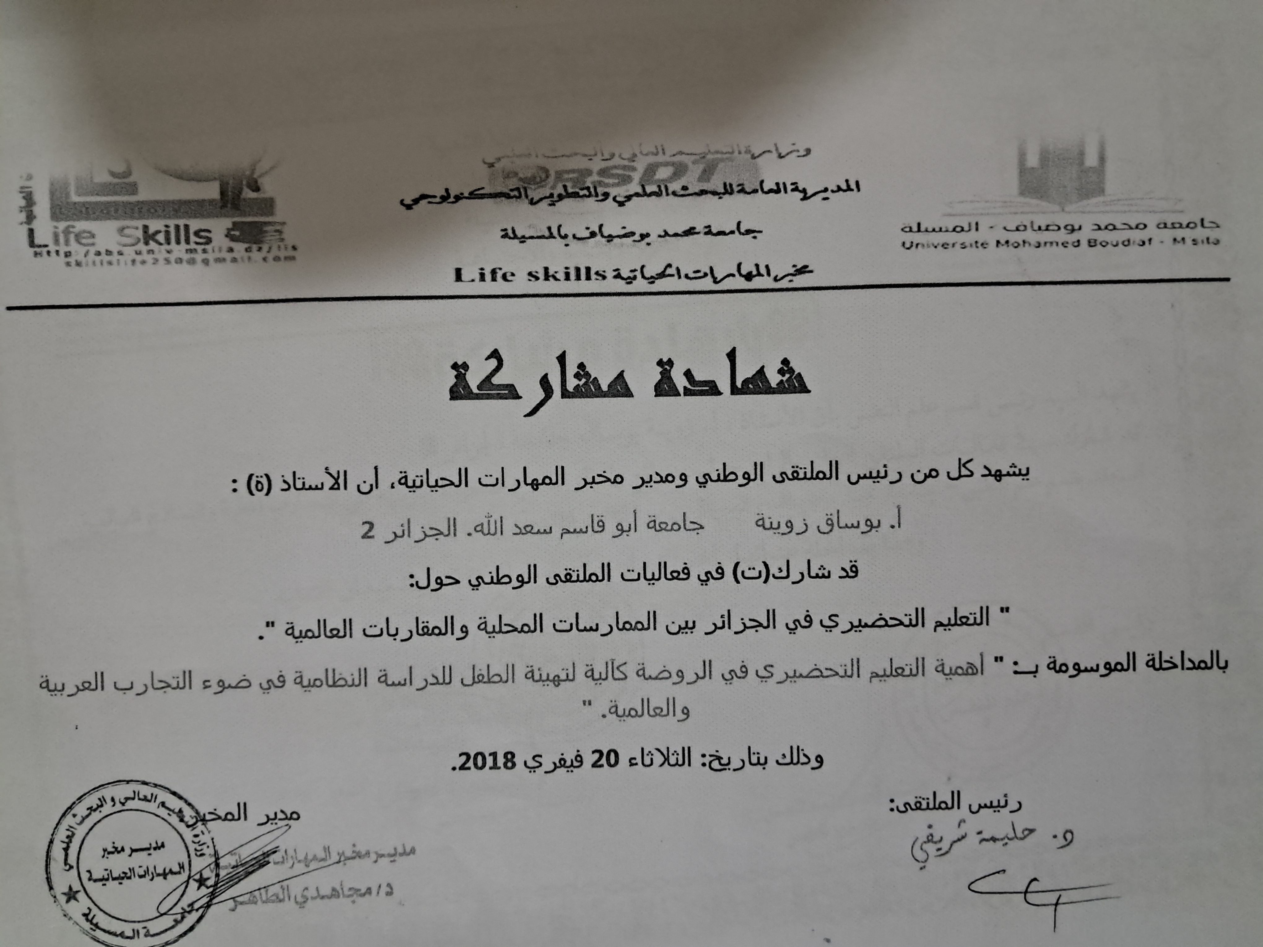 M. BOUSSAG Zouina, (2018-02-20), "أهمية التعليم التحضيري في الروضة كآلية لتهيئة الطفل للدراسة النظامية في ضوء التجارب العربية والعالمية", [national] الملتقى الوطني حول التعليم التحضيري في الجزائر بين الممارسات المحلية والمهارات العالمية , المسيلة.جامعة المسيلة