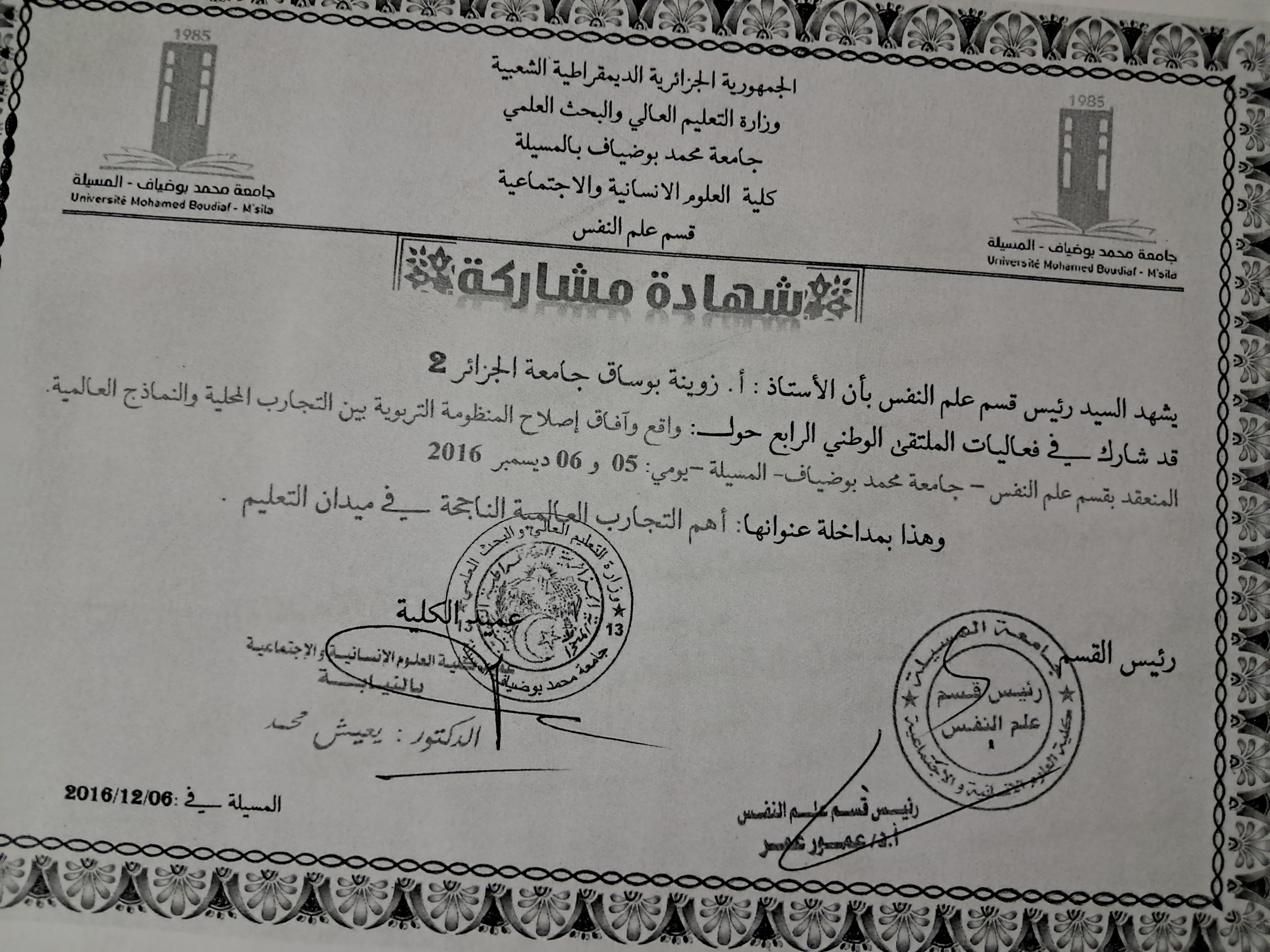 M. BOUSSAG Zouina, (2016-12-06), "أهم التجارب العالمية الناجحة في ميدان التعليم", [national] الملتقى الوطني الرابع حول واقع وآفاق إصلاح المنظومة التربوية بين التجارب المحلية والنماذج العالمية , المسيلة.جامعة المسيلة