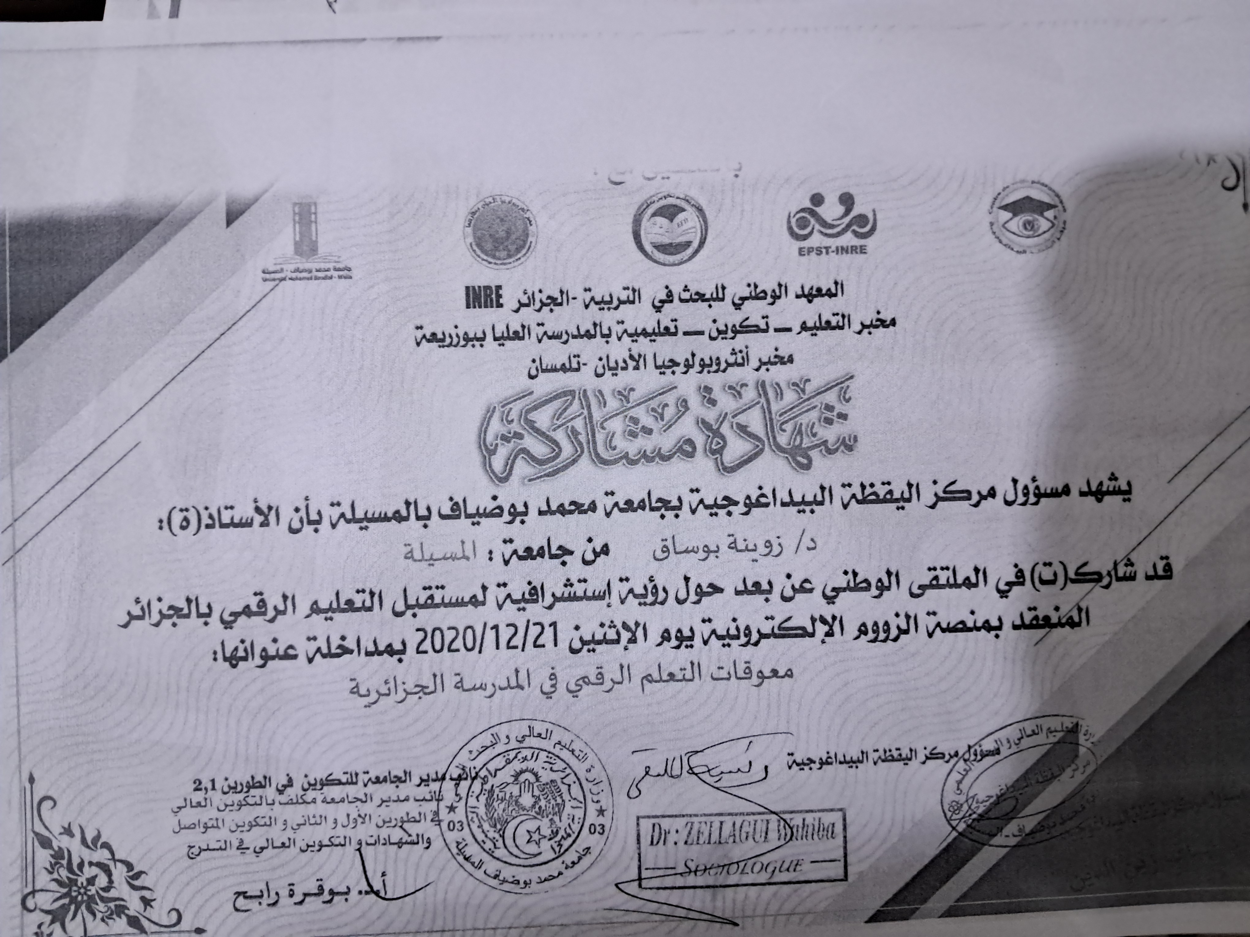 M. BOUSSAG Zouina, (2020-11-21), "معوقات التعامل الرقمي في المدرسة الجزائرية", [national] الملتقى الوطني عن بعد حول رؤية استشراف لمستقبل التعليم الرقمي بالجزائر , منصة زووم الإلكترونية .جامعة المسيلة
