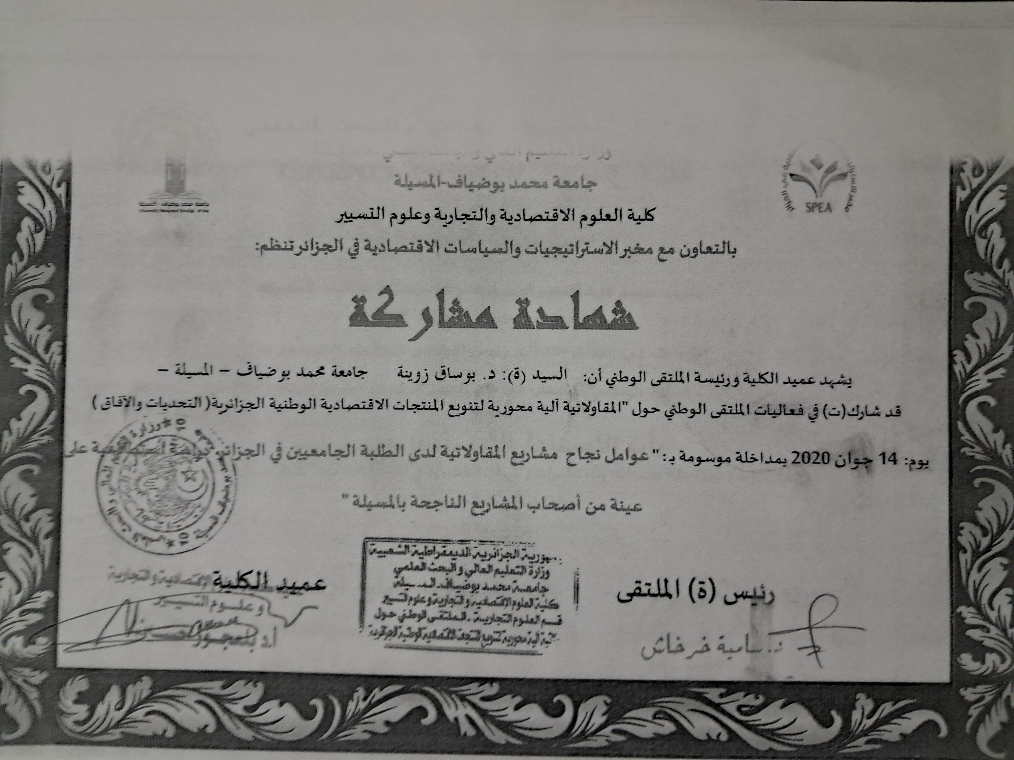 M. BOUSSAG Zouina, (2023-12-19), "عوامل نجاه المشاريع المقاولاتية لدى الطلبة الجامعيين في الجزائر دراسة استطلاعيةعلى عينة من أصحاب المشاريع الناجحة بالمسيلة", [national] الملتقى الوطني حول المقاولاتية آلية مرورية لتنويم المنتجات الاقتصادية الوطنية الجزائرية )التحديات والآفاق( , المسيلة.جامعة المسيلة