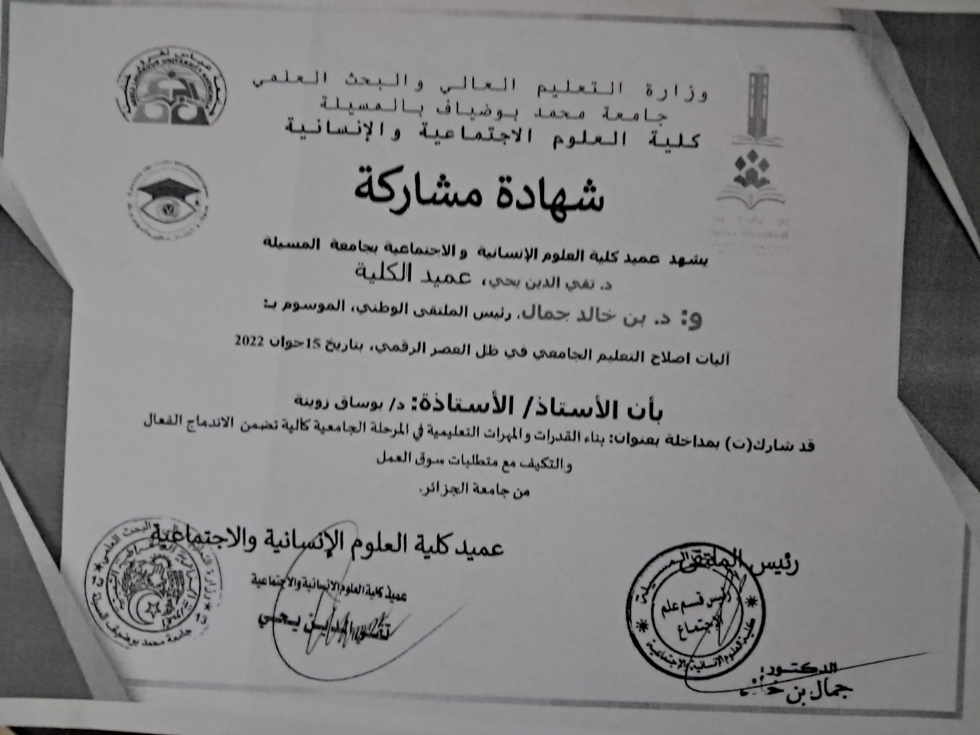 M. BOUSSAG Zouina, (2022-06-15), "بناء القدرات والمهارات التعليمية في المرحلة الجامعية كآلية تضمن الإندماج الفعال والتكييف مع متطلبات سوق العمل", [national] آليات إصلاح التعليم الجامعي في ظل العصر الرقمي , المسيلة.جامعة المسيلة