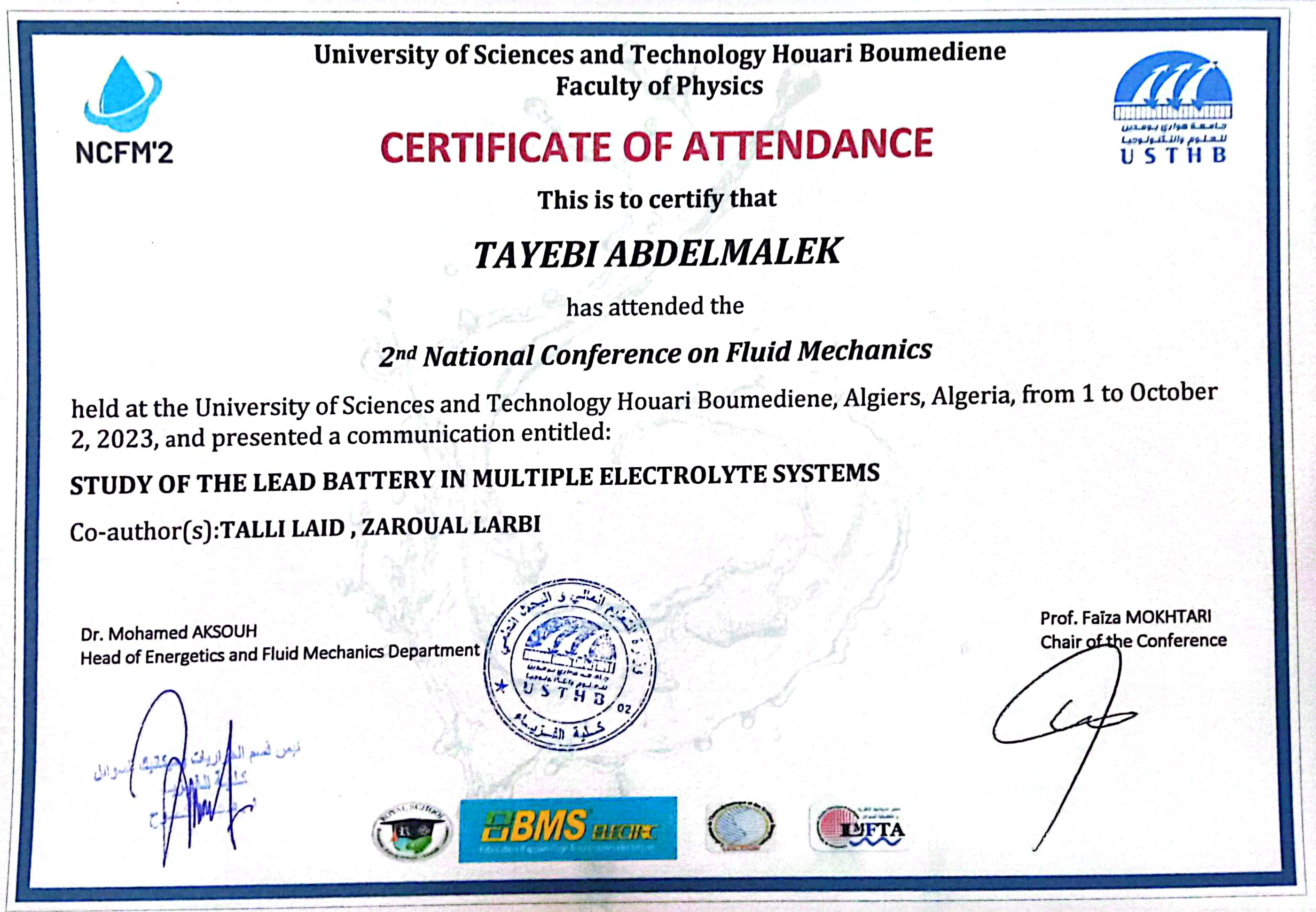 M. TELLI Laid, (2023-10-01), "STUDY OF THE LEAD BATTERY IN MULTIPLE ELECTROLYTE SYSTEMS", [national] The 2nd National Conference on Fluid Mechanics , Faculty of Physics, University of Science and Technology Houari Boumediene, Algiers