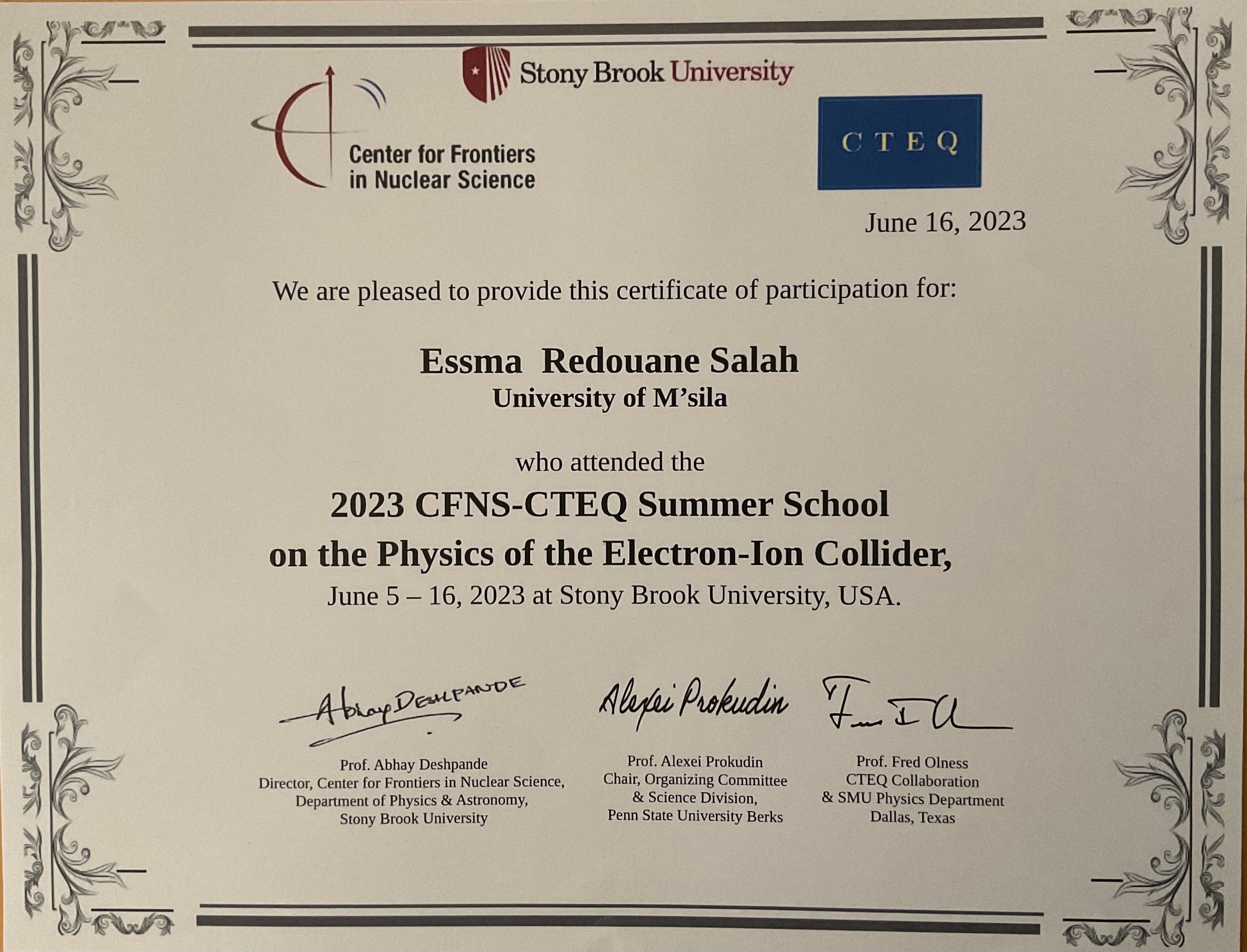 M. REDOUANE SALAH Essma, (2023-06-16), "Mont Carlo Efficient phase space generator", [international] CFNS-CTEQ Summer School on the Physics of the Electron-Ion Collider , USA