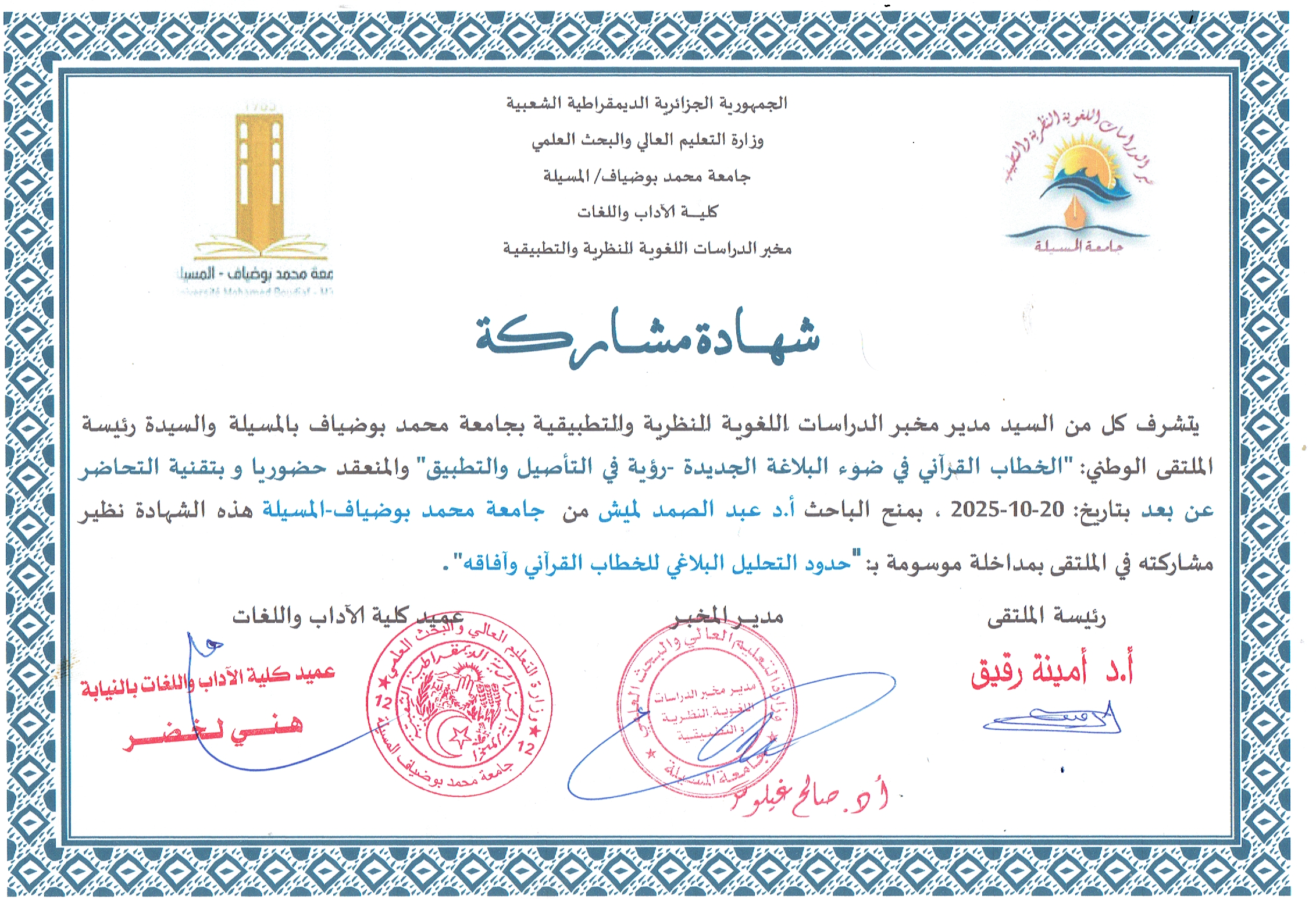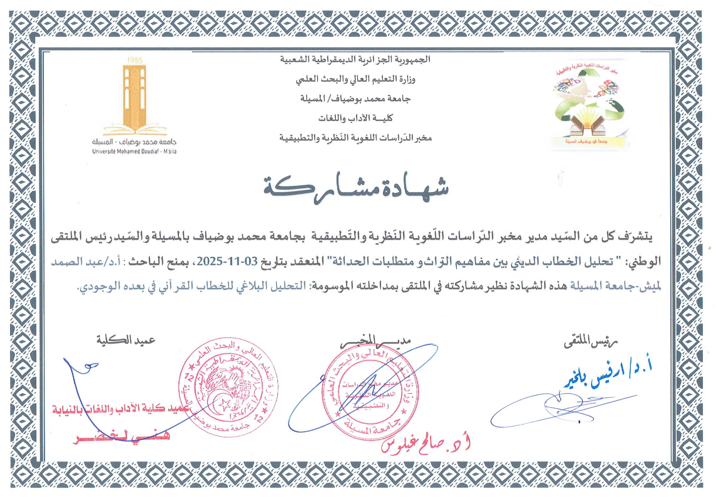 M. LAMICHE Abdessamed, (2025-11-03), "التحليل البلاغي للخطاب القرآني في بعده الوجودي", [national] تحليل الخطاب الديني بين مفاهيم التراث ومتطلبات الحداثة , مخبر الدراسات اللغوية النظرية والتطبيقية بجامعة محمد بوضياف بالمسيلة