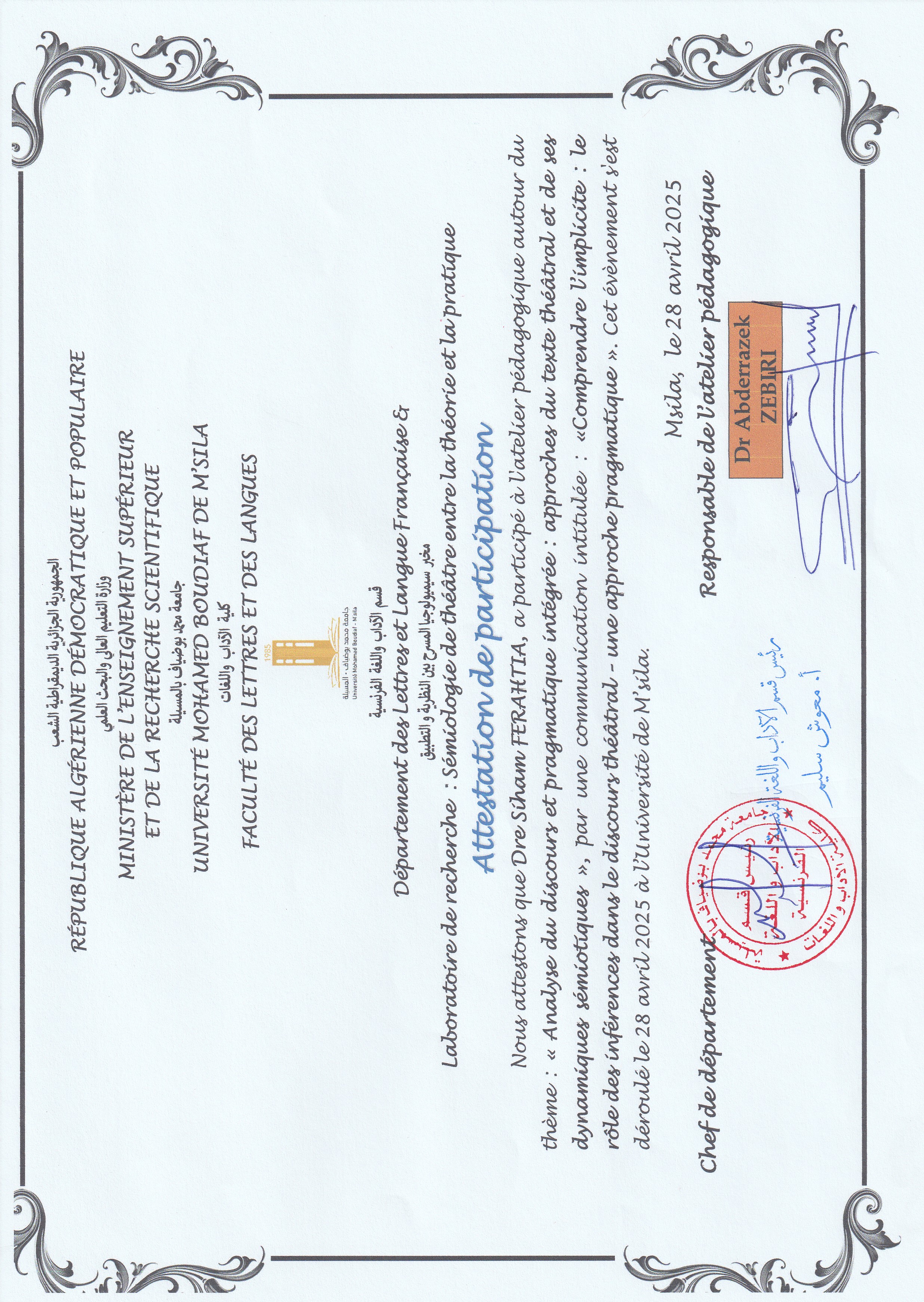 M. FERAHTIA Siham, (2025-04-28), "Comprendre l’implicite : le rôle des inférences dans le discours théâtral – une approche pragmatique", [national] Analyse du discours et pragmatique intégrée : Approches du texte théâtral et de ses dynamiques sémiotiques , Université de m'sila