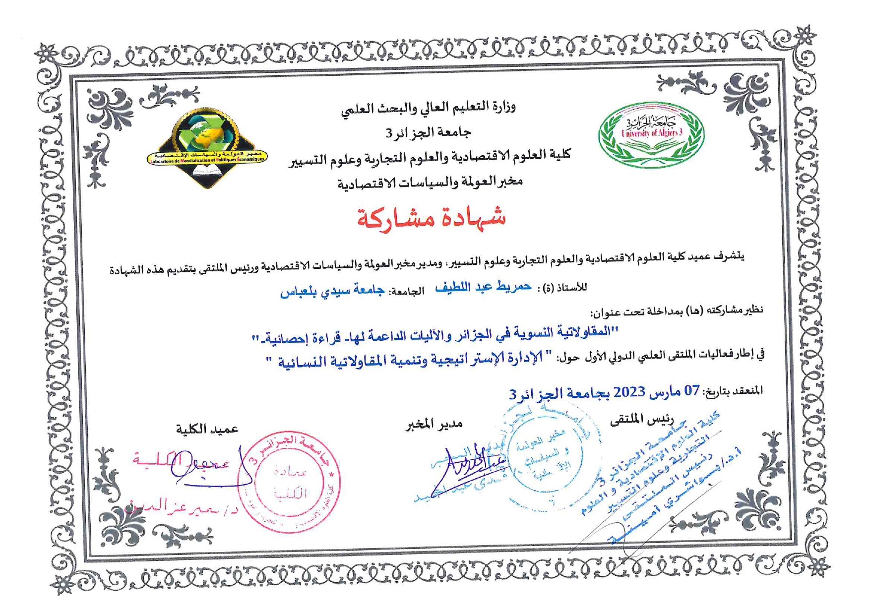 M. ABDELATIF Hamrit, (2023-03-07), "المقاولاتية النسوية في الجزائر والآليات الداعمة لها- قراءة إحصائية-", [international] الإدارة الاستراتيجية وتنمية المقاولاتية النسائية , كلية العلوم الاقتصادية ، التجارية وعلوم التسيير. جامعة الجزائر 3، الجزائر