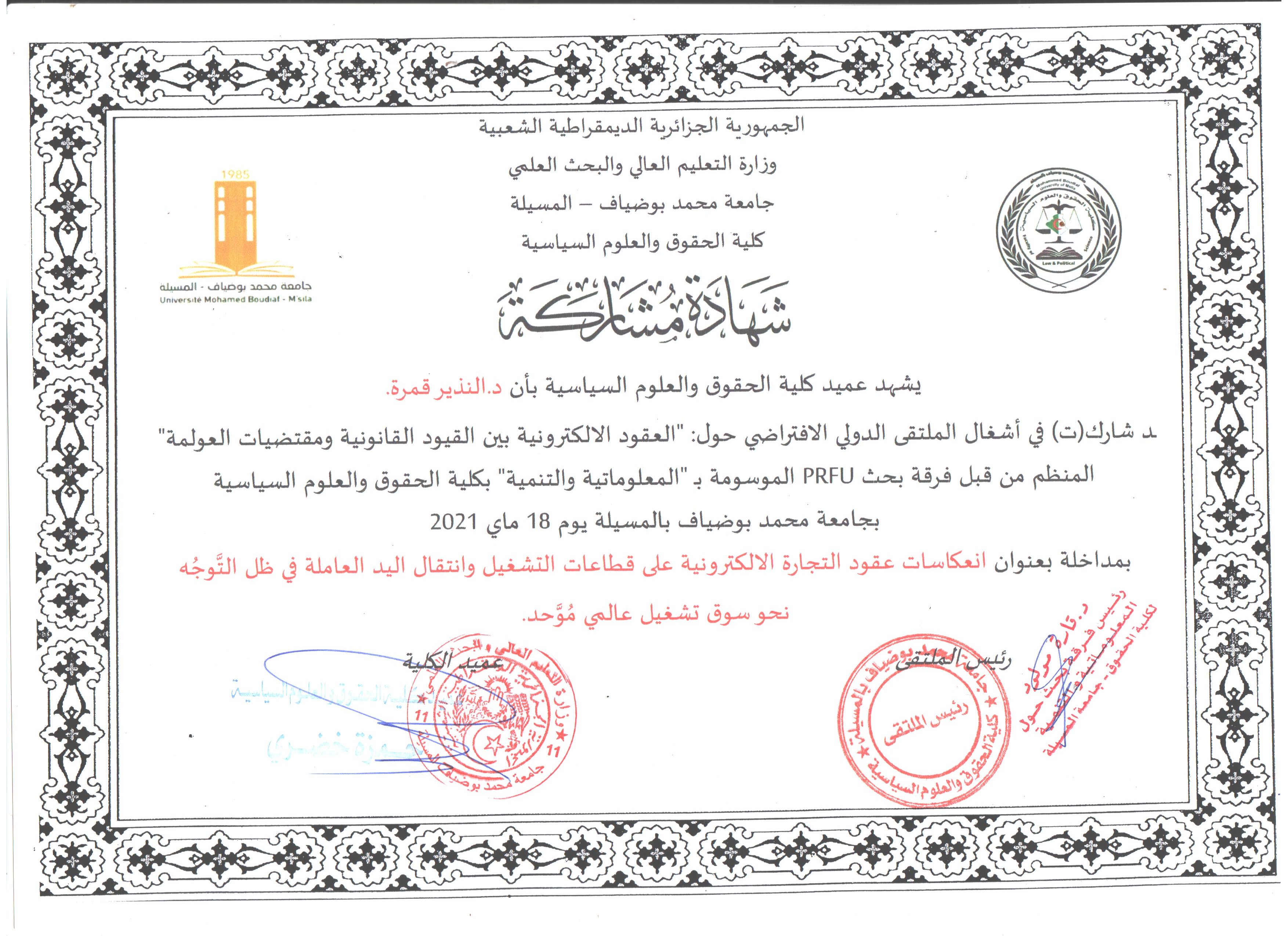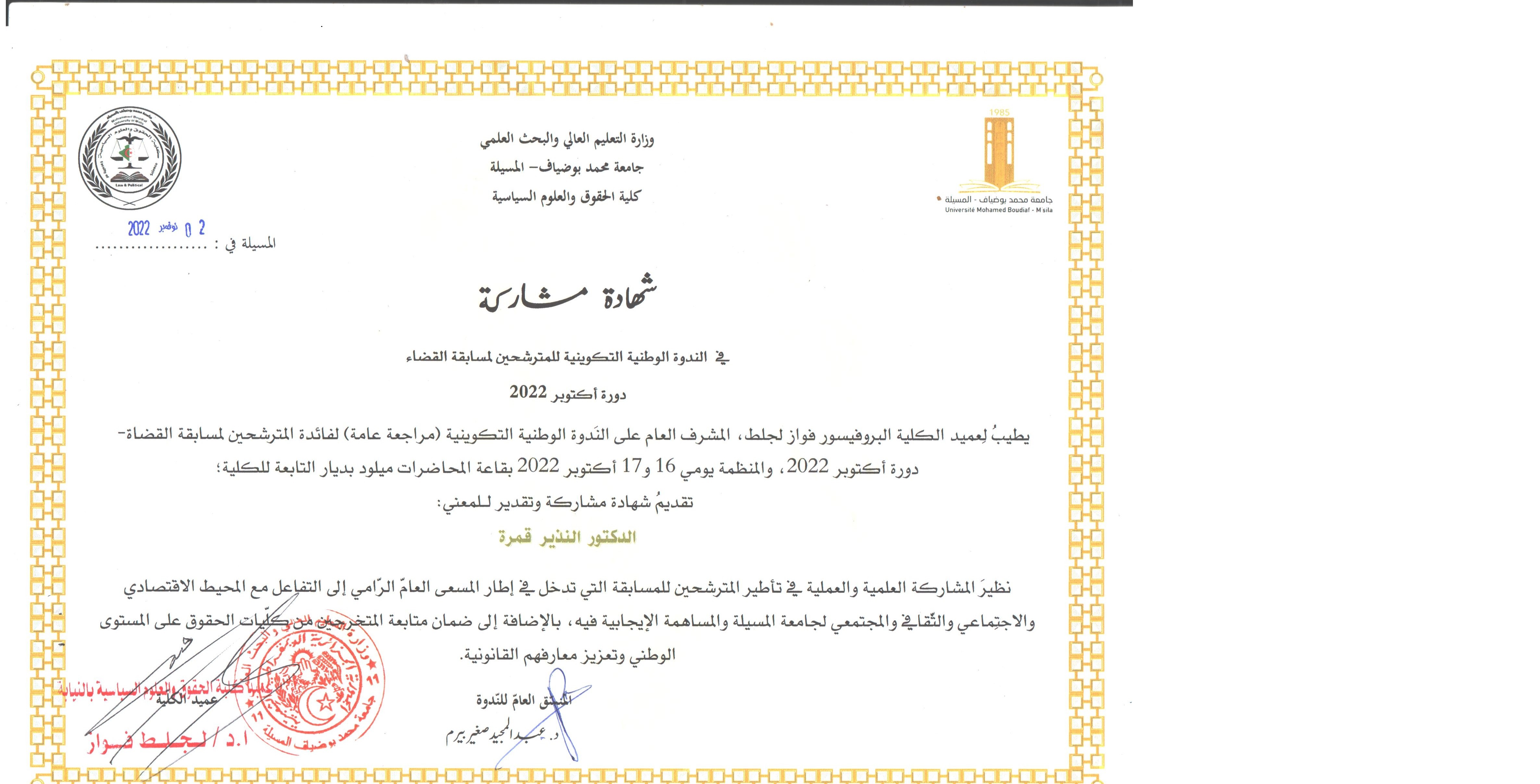 M. NADIR Guemra, (2022), "مراجعة عامة لفائدة المترشحين لمسابقة القضاء", [national] الندوة الوطنية التكوينية للمترشحين لمسابقة القضاء , جامعة المسيلة