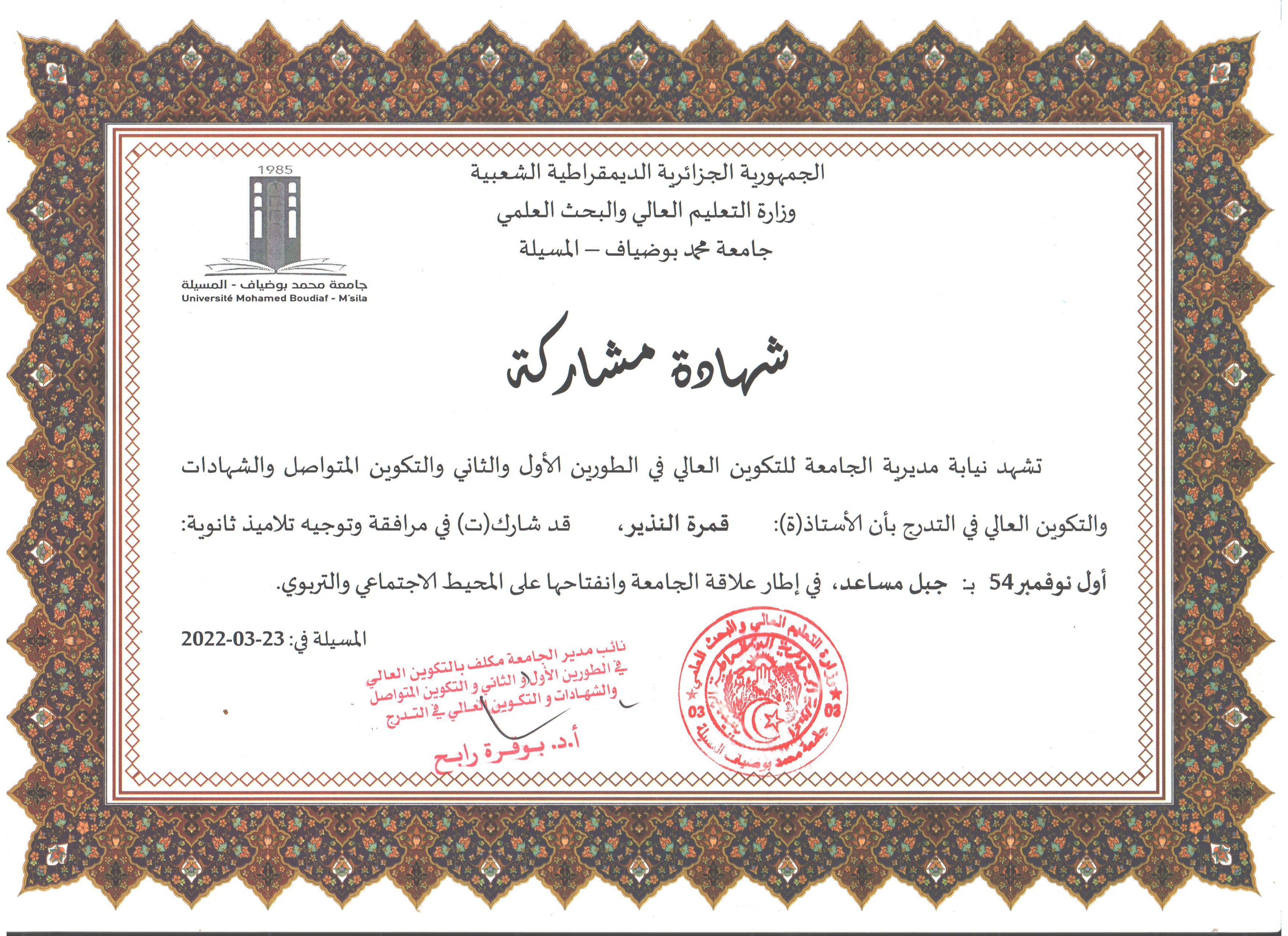 M. NADIR Guemra, (2022), "مشاركة في المرافقة وتوجيه تلاميذ ثانوية", [national] الجامعة وانفتاحها على المحيط , جامعة المسيلة