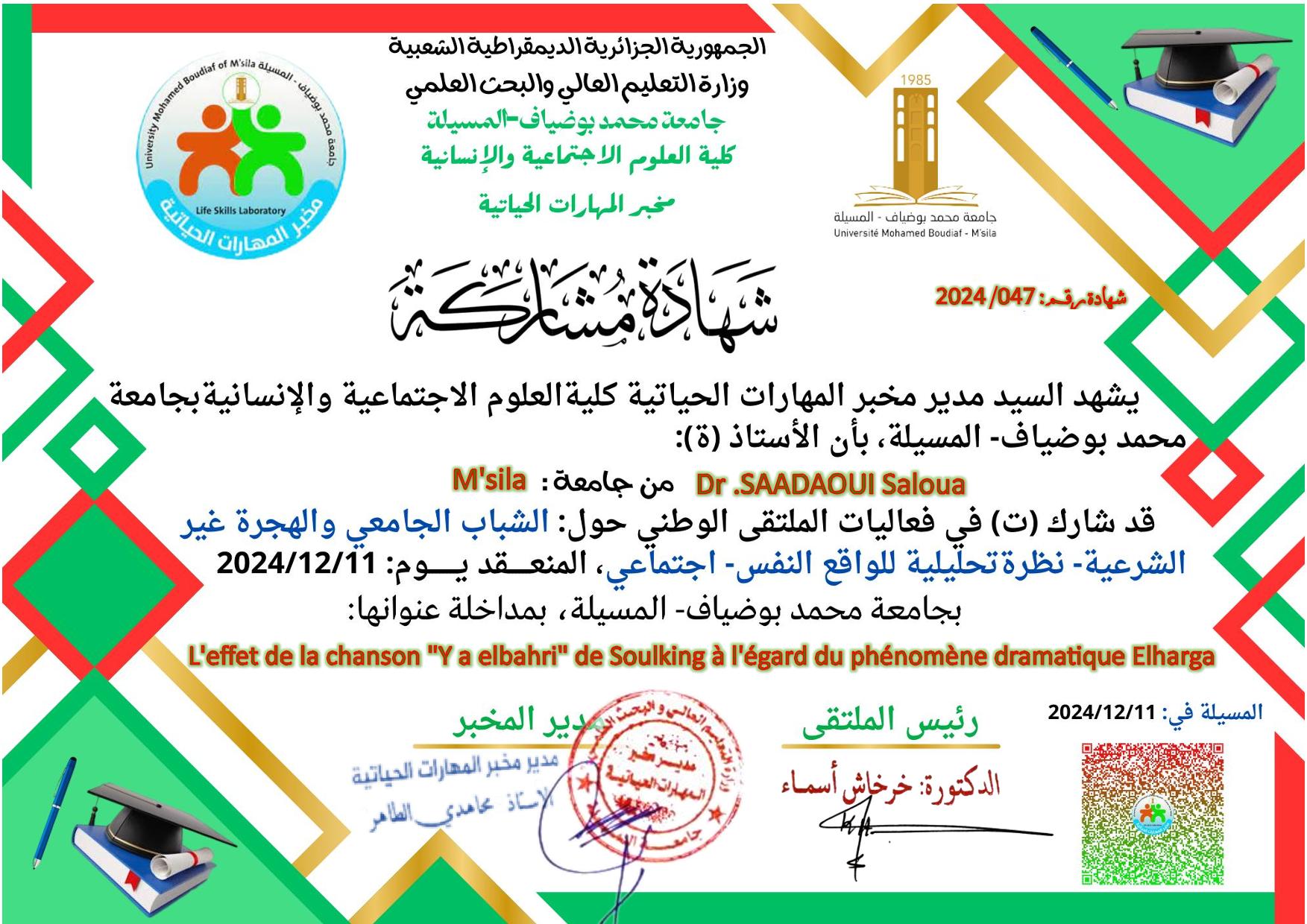 M. SAADAOUI Saloua, (2024-12-11), "L'effet de la chanson"Ya elbahri" de Soulking à l'égard du phénomène dramatique Elharga", [national] الشباب الجامعي و الهجرة غير الشرعية-نظرة تحليلية للواقع نفس-اجنماعي , université de Ms'la