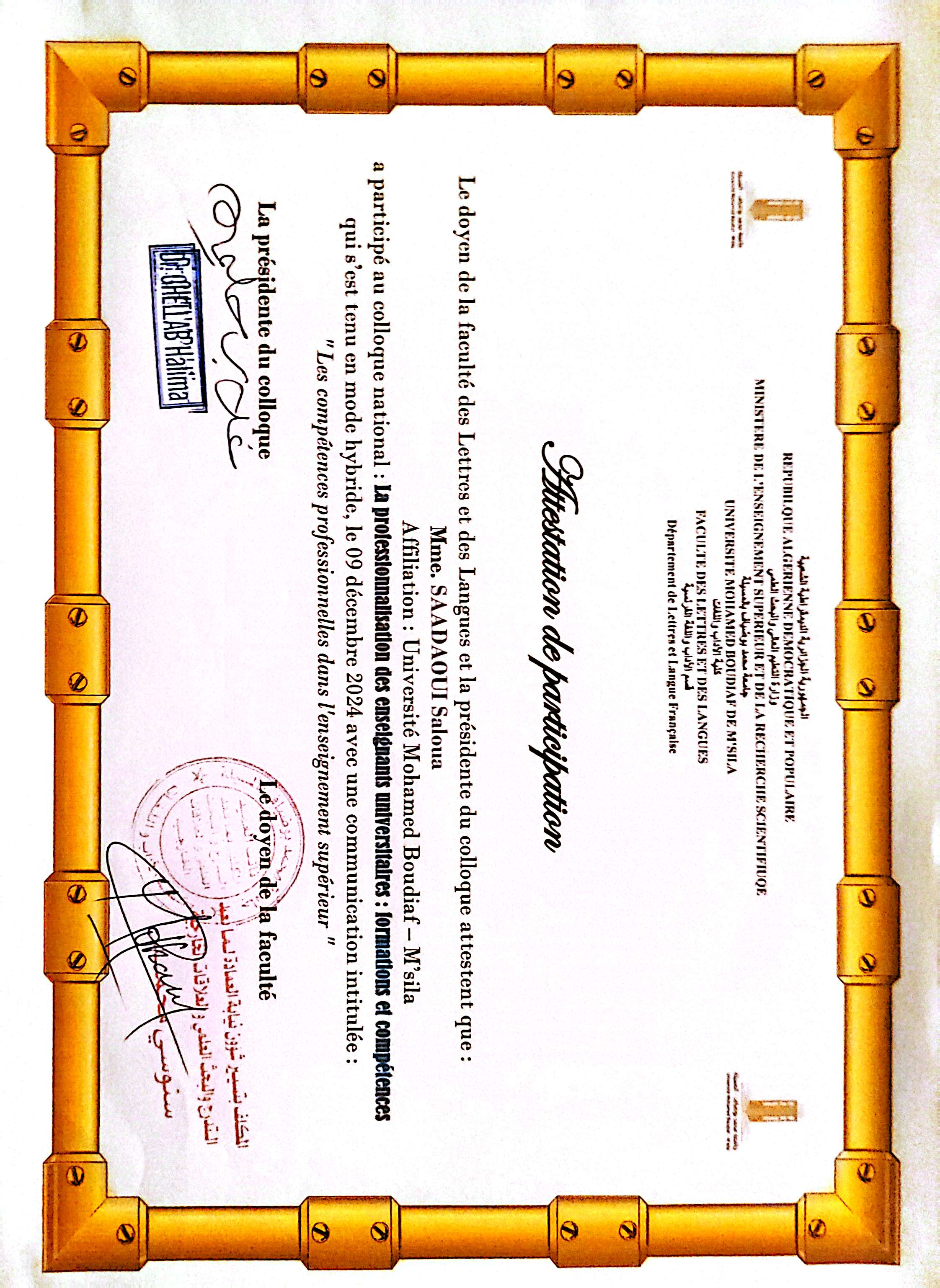 M. SAADAOUI Saloua, (2024-12-09), "La professionnalisation des enseignants universitaires: formations et competences", [national] Les compétences professionnelles dans l'enseignement supérieur , université de Ms'la