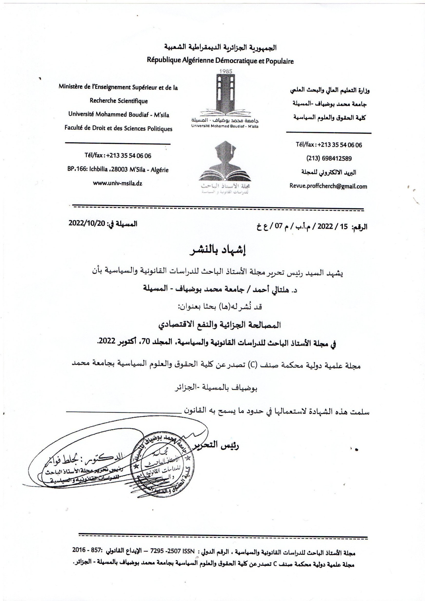 M. AHMED Haltali, (2022), "المصالحة الجزائية والنفع الاقتصادي", [national] مجلة الأستاذ الباحث للدراسات القانونية والسياسية , جامعة المسيلة