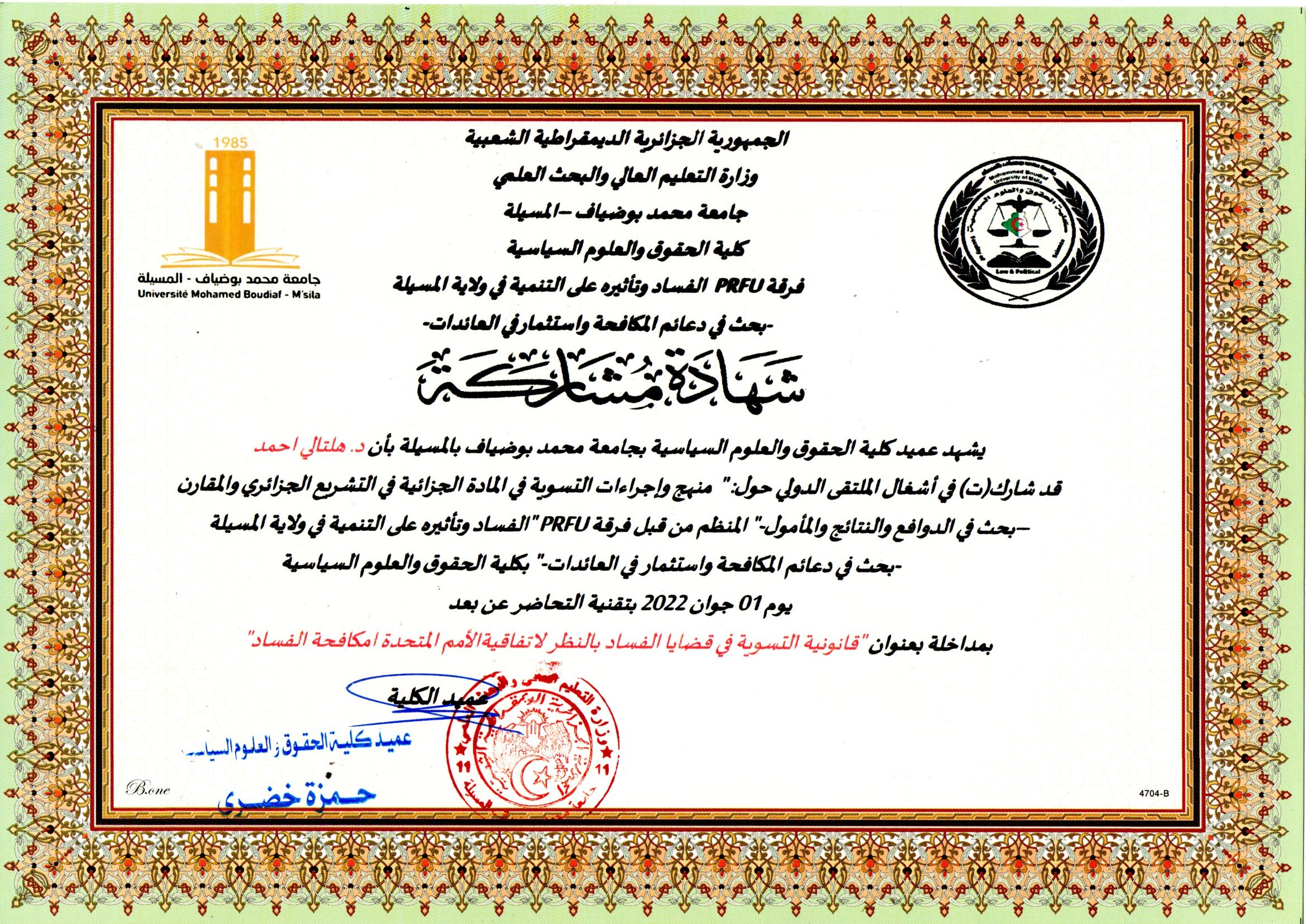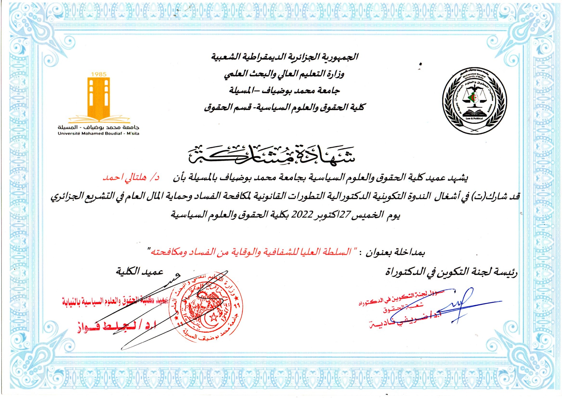 M. AHMED Haltali, (2022), "السلطة العليا للشفافية والوقاية من الفساد ومكافحته", [national] الندوة التكوينية الدكتورالية التطورات القانونية لمكافحة الفساد وحماية المال العام , كلية الحقوق، جامعة المسيلة
