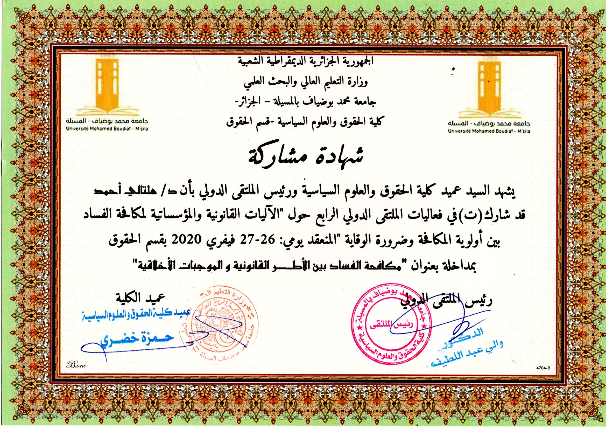 M. AHMED Haltali, (2020), "مكافحة الفساد بين الأطر القانونية والموجبات الاخلاقية", [international] الآليات القانونية والمؤسساتية لمكافحة االفساد بين أولوية المكافحة وضرورة الوقاية , جامعة المسيلة