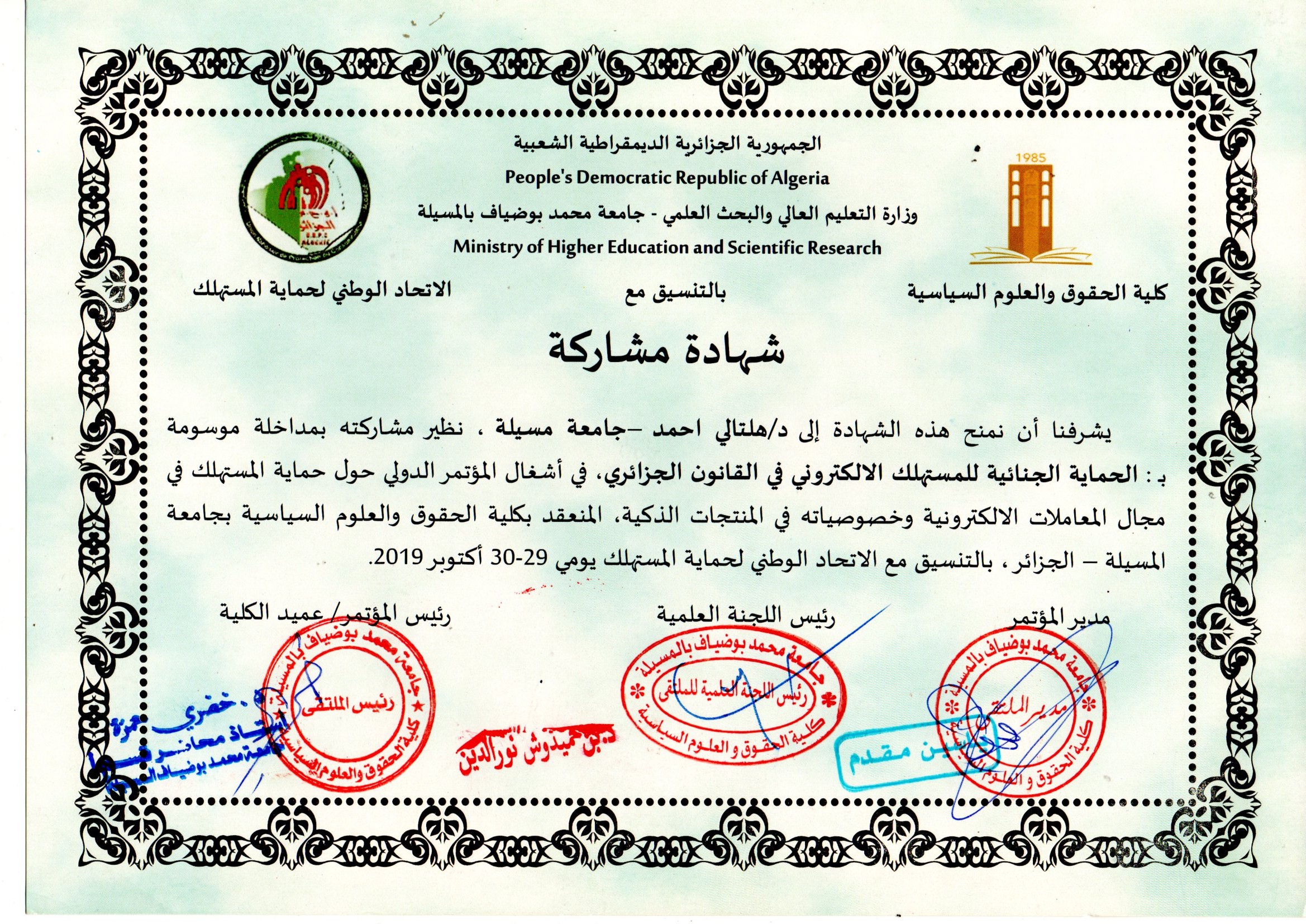 M. AHMED Haltali, (2019), "الحماية الجنائية للمستهلك الالكتروني في القاانون لجزائري", [international] المؤتمر الدولي حول حمااية المستهلك في مجال المعاملات الالكتورنية وخصوصياته في المنتجات الذكية , جامعة المسيلة