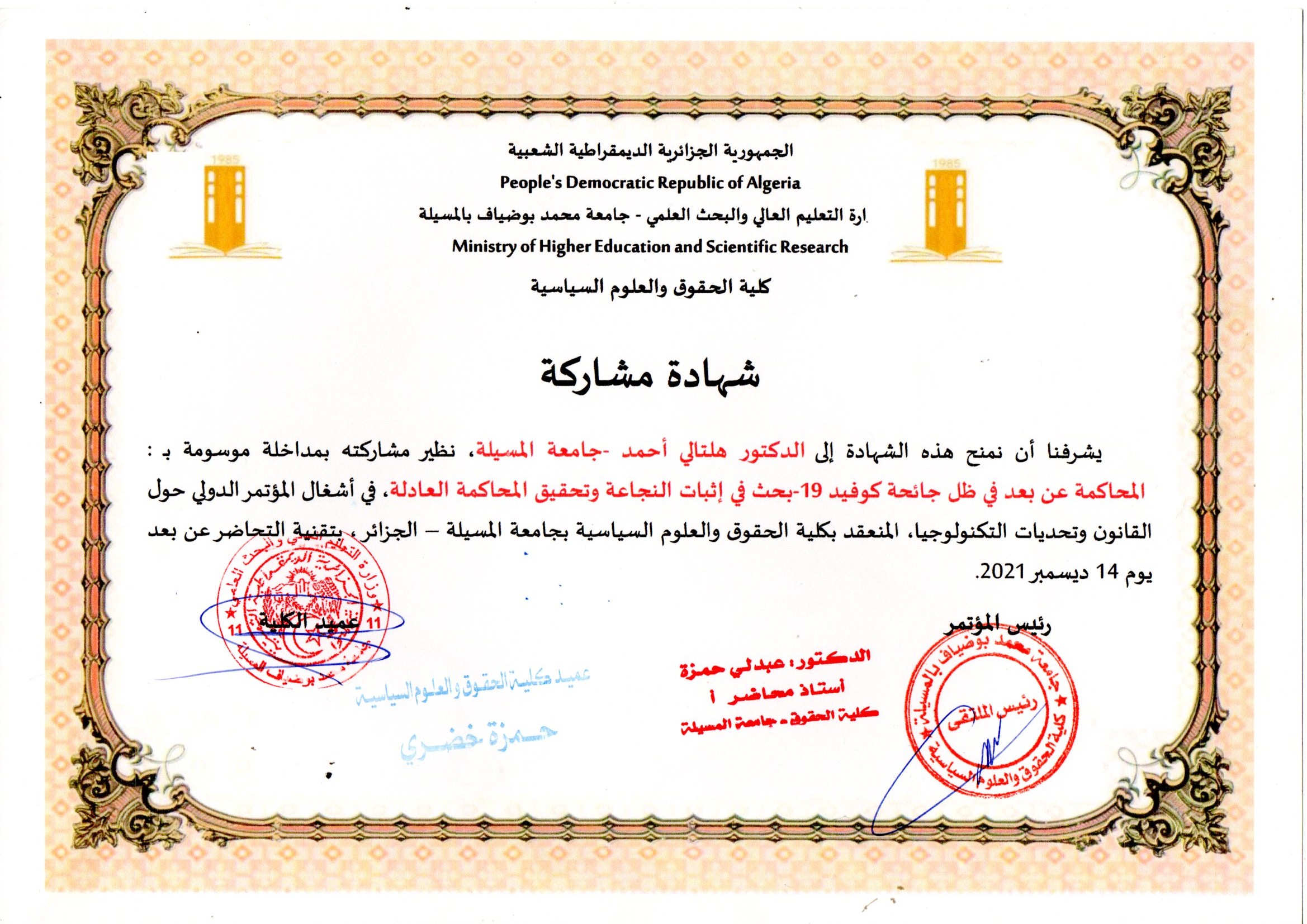 M. AHMED Haltali, (2021), "المحاكمة عن بعد في ظل جائحة كوفيد 19 - بحث في إثبات النجاعة وتحقيق المحاكمة العادلة-", [international] المؤتمر الدولي حول القانون وتحديات التكنولوجيا , جامعة المسيلة