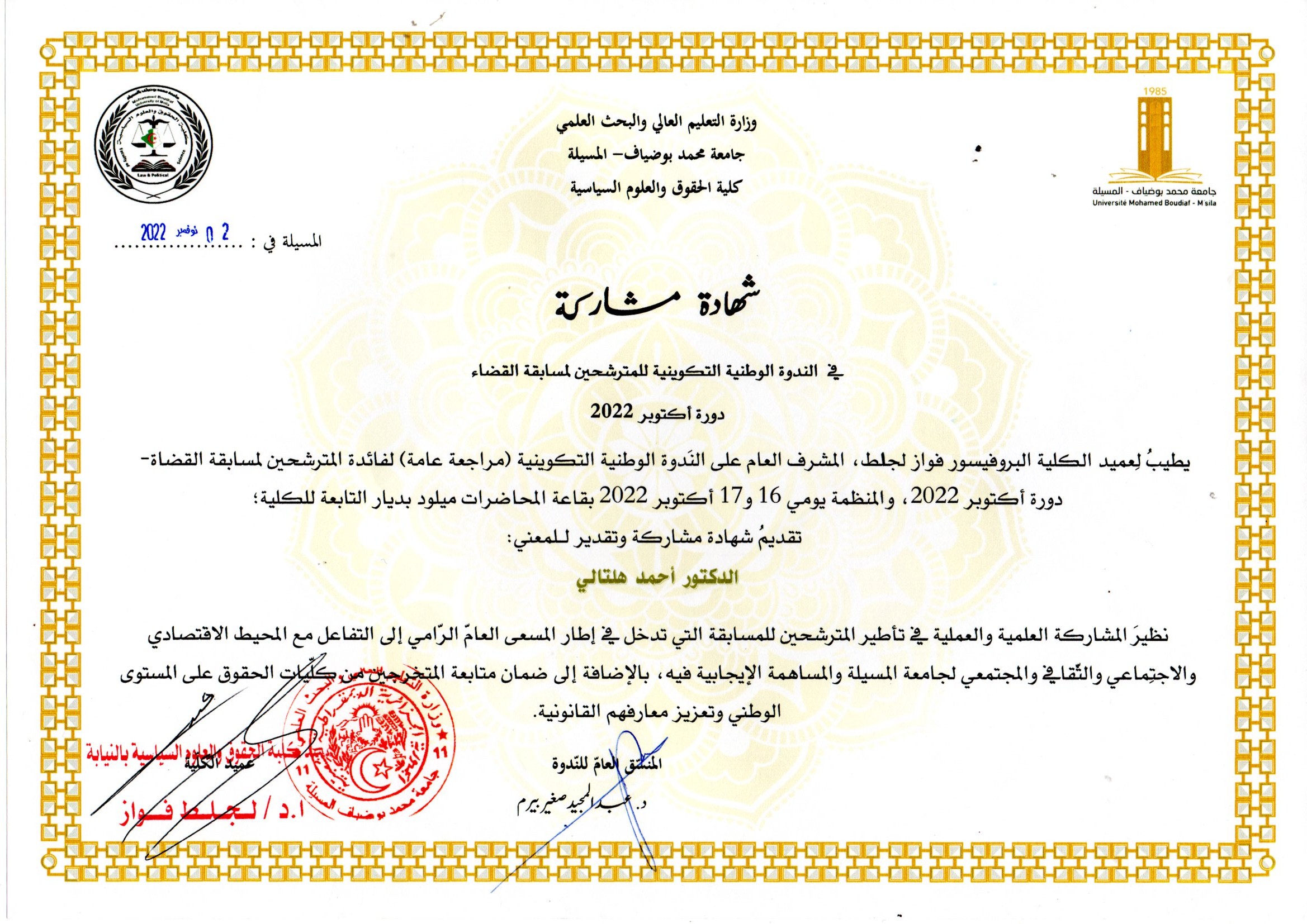 M. AHMED Haltali, (2022), "توجيهات عامة", [national] لنوة الوطنية التكوينية لفائدة المترشحين لمسابقة القضاء , كلية الحقوق، جامعة المسيلة
