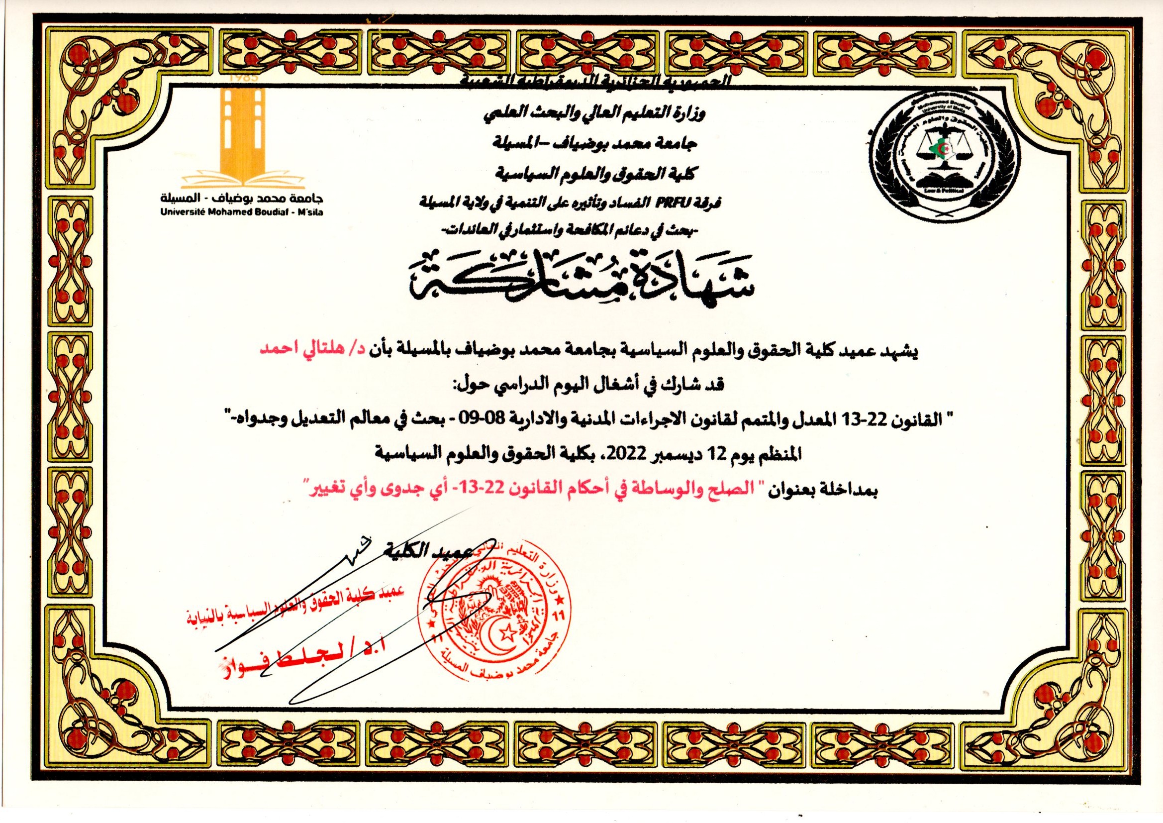 M. AHMED Haltali, (2022), "الصلح والوساطة في أحكام القانون 22-13 أي جدوى وأي تغيير", [national] القانون 22-13 المعدل والمتمم للقانون 08-09 بحث في معالم التعديل وجدواه , جامعة المسيلة