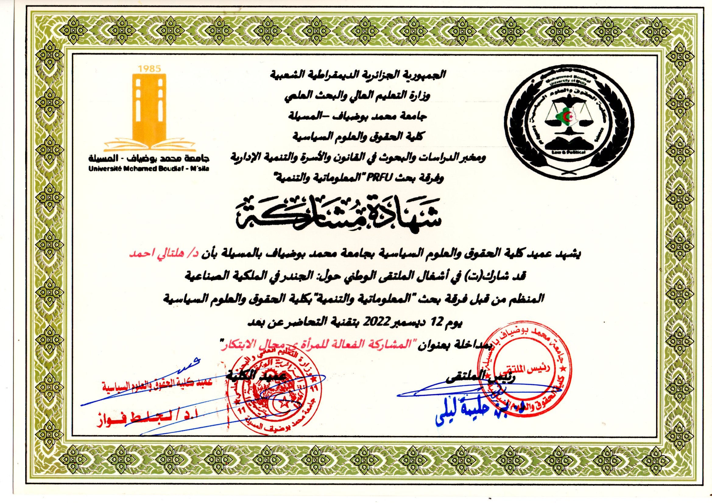 M. AHMED Haltali, (2022), "المشاركة الفعالة للمرأة في مجال الابتكار", [national] الجندر في الملكية الصناعية , جامعة المسيلة