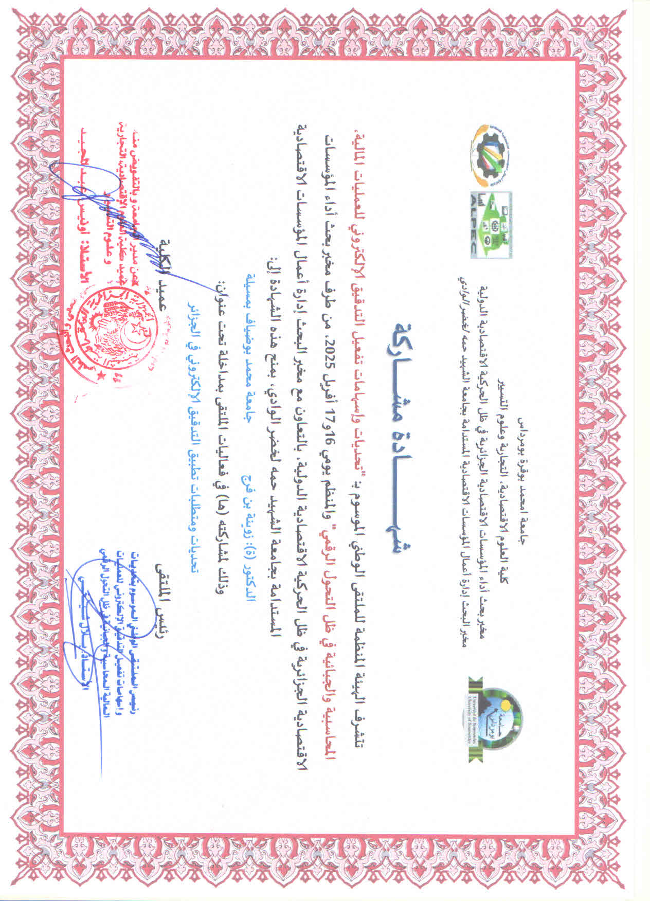 M. BENFREDJ Zouina, (2025-04-16), "تحديات ومتطلبات تطبيق لبتدقيق الالكتروني في الجزائر", [national] تحديات ةاسهامات التدقيق الالكتروني للعمليات المالية المحاسبية والجبائية في ظل التحول الرقمي , جامهة الشهيد حمة لخضر الوادي