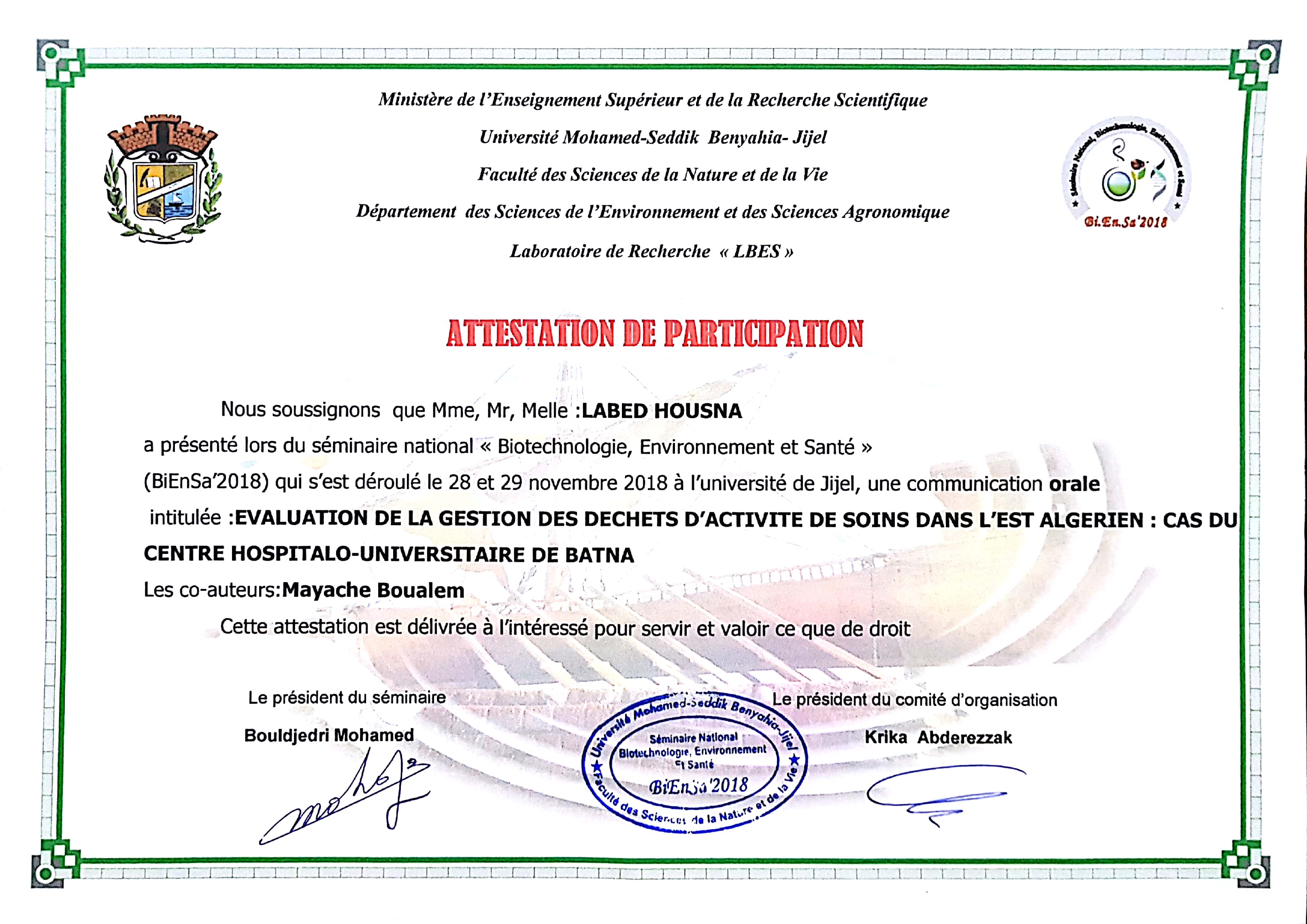 M. BOUALEM Mayache, (2018-11-27), "Evaluation de la gestion des déchets d’activité de soins dans l’est Algérien ; Cas du Centre Hospitalo-Universitaire de Batna", [national] Séminaire National ; Biotechnologie, Environnement et Santé, , Université de Jijel