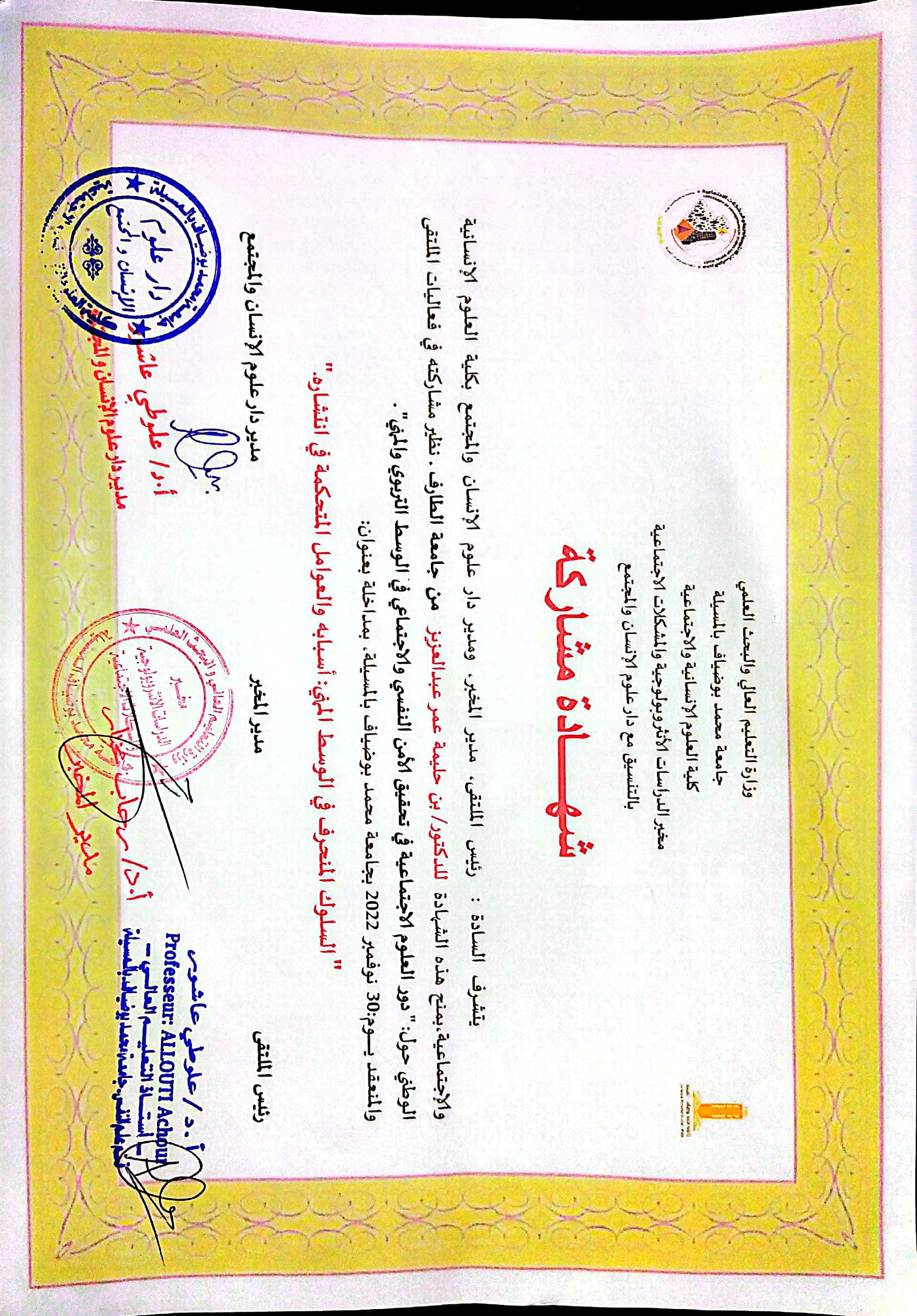 M. BENHALIMA Omar abdelaziz, (2024-10-30), "ظاهرة المخدرات في البيئة المدرسية وسبل الوقاية منها", [international] الادمان على المخدرات في الوسط المدرسي-وقاية وارشاد , جامعة الشاذلي بن جديد-الطارف
