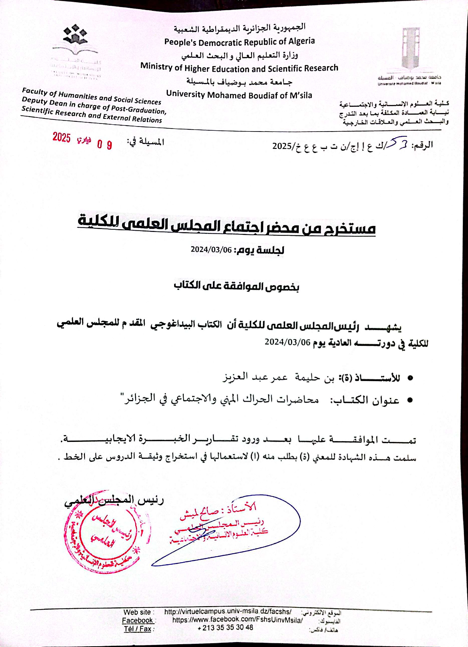 M. BENHALIMA Omar abdelaziz, (2024-03-06), "محاضرات الحراك المهني و الاجتماعي في الجزائر", [national] , جامعة محمد بوضياف المسيلة