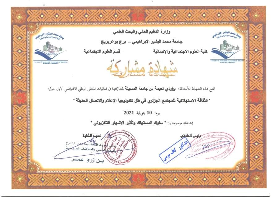 M. BERARDI Naima, (2021), "تاثير الاشهار وسلوك المستهلك", [national] الثقافة الاستهلاكية في المجتمع الجزائري في ظل تكنولوجيا الاعلام والاتصال الحديثة , كلية العلوم الإنسانية و الاجتماعية المركز الجامعي البشير الابراهيمي برج بوعريريج