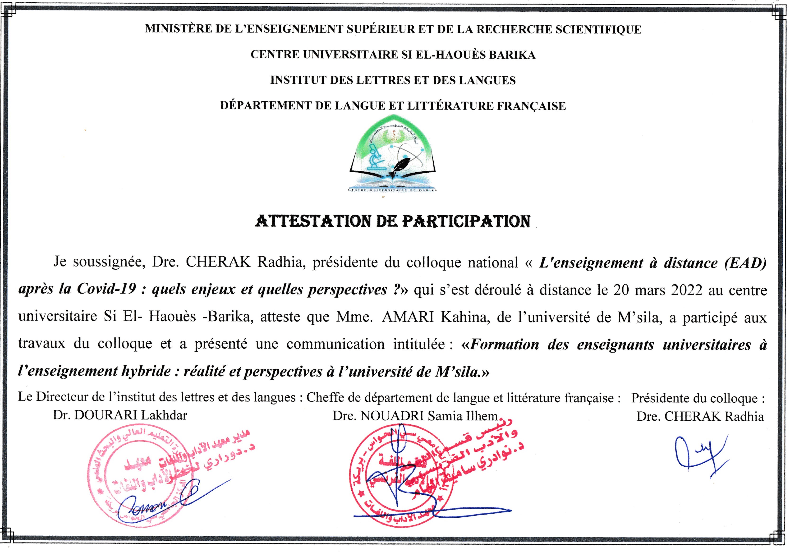 M. AMARI Kahina, (2022-03-20), "Formation des enseignanats universitaires à l'enseignement hybride : réalités et perspectives à l'université de M'sila", [national] AMARI Kahina , centre universitaire SI ELHAOUES -BARIKA