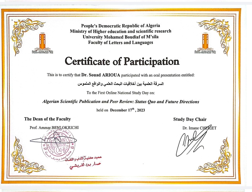 M. ARIOUA Souad, (2023-12-17), "السرقة العلمية بين أخلاقيات البحث العلمي والواقع الملموس", [national] واقع ممارسات النشر العلمي في الجزائر , جامعة المسيلة