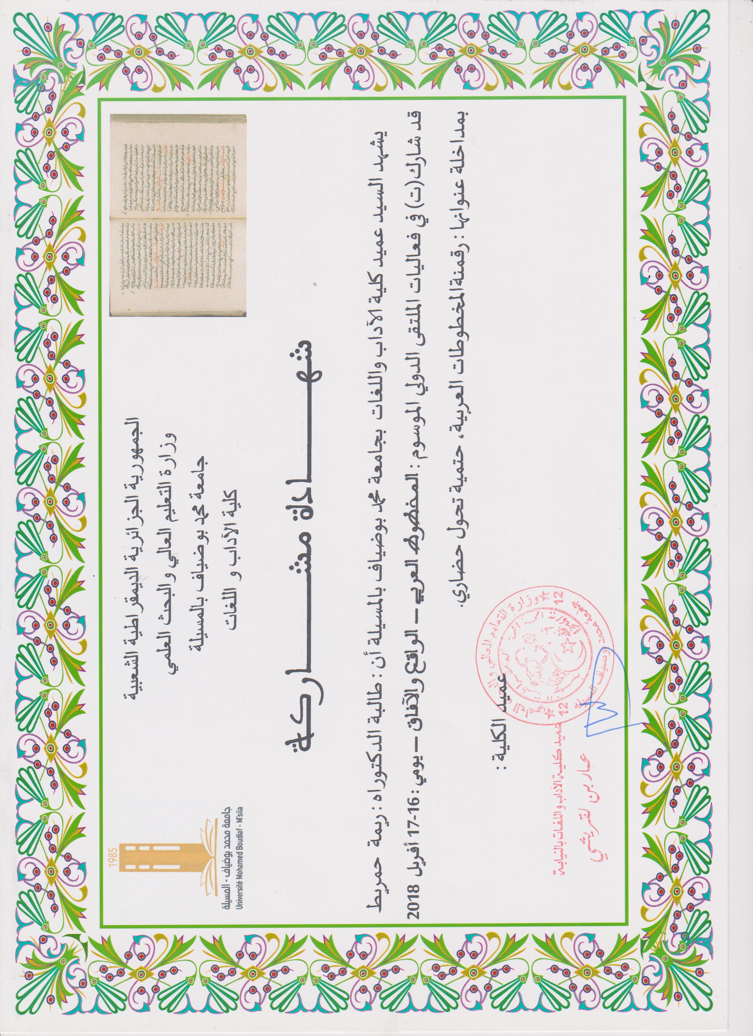 M. RIMA Hamrit, (2018-04-16), "رقمنة المخطوطات العربية، حتمية تحول حضاري", [international] المخطوط العربي -الواقع والآفاق- , University of M'sila