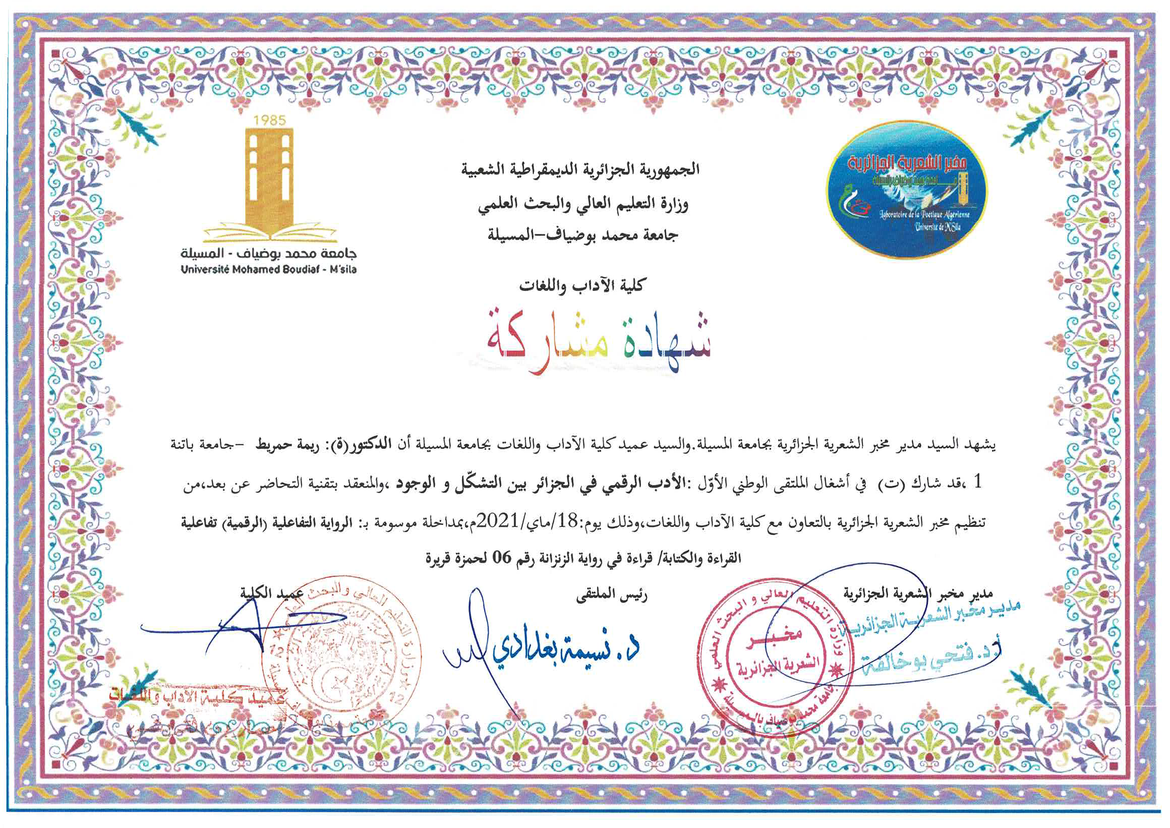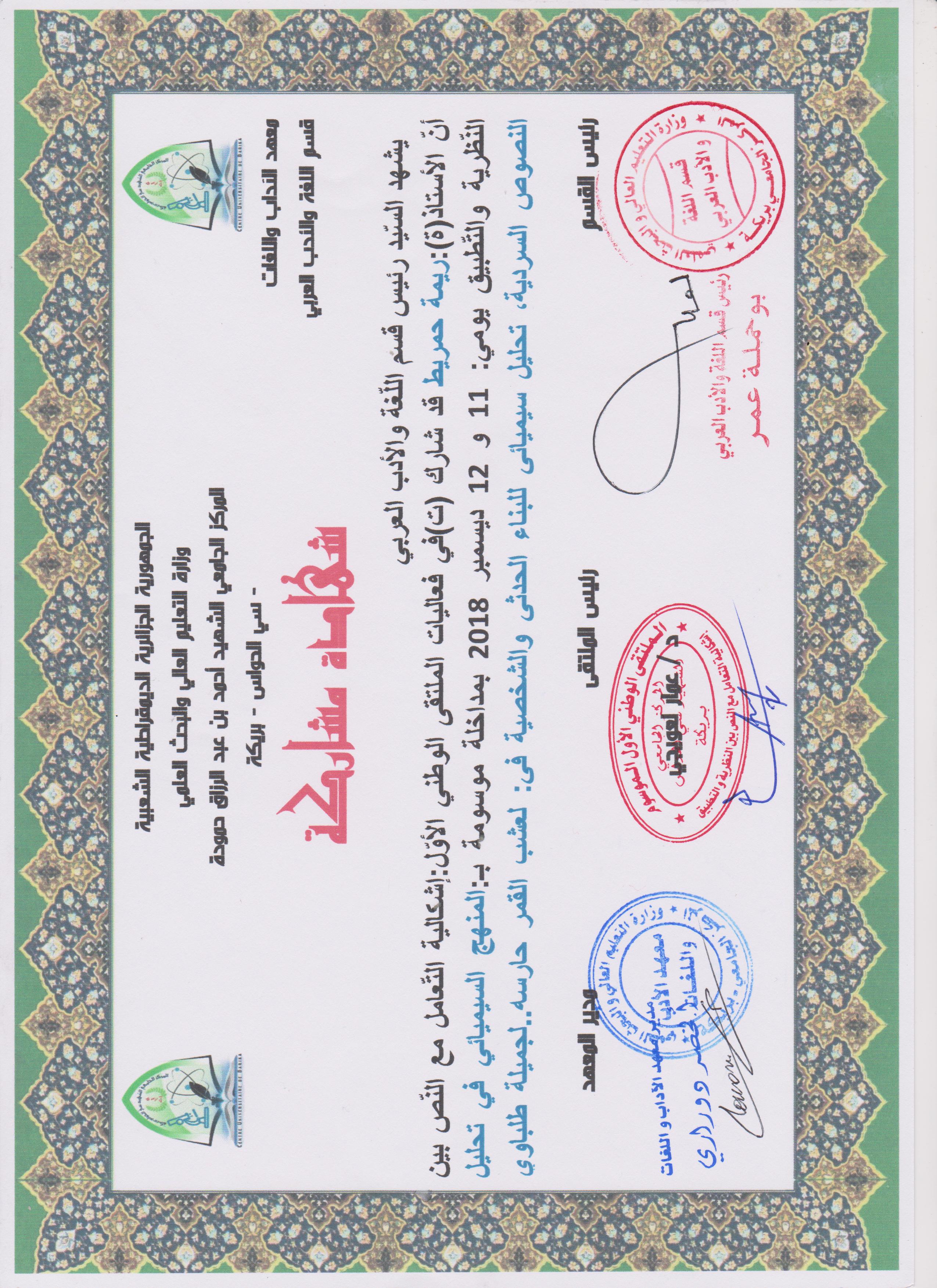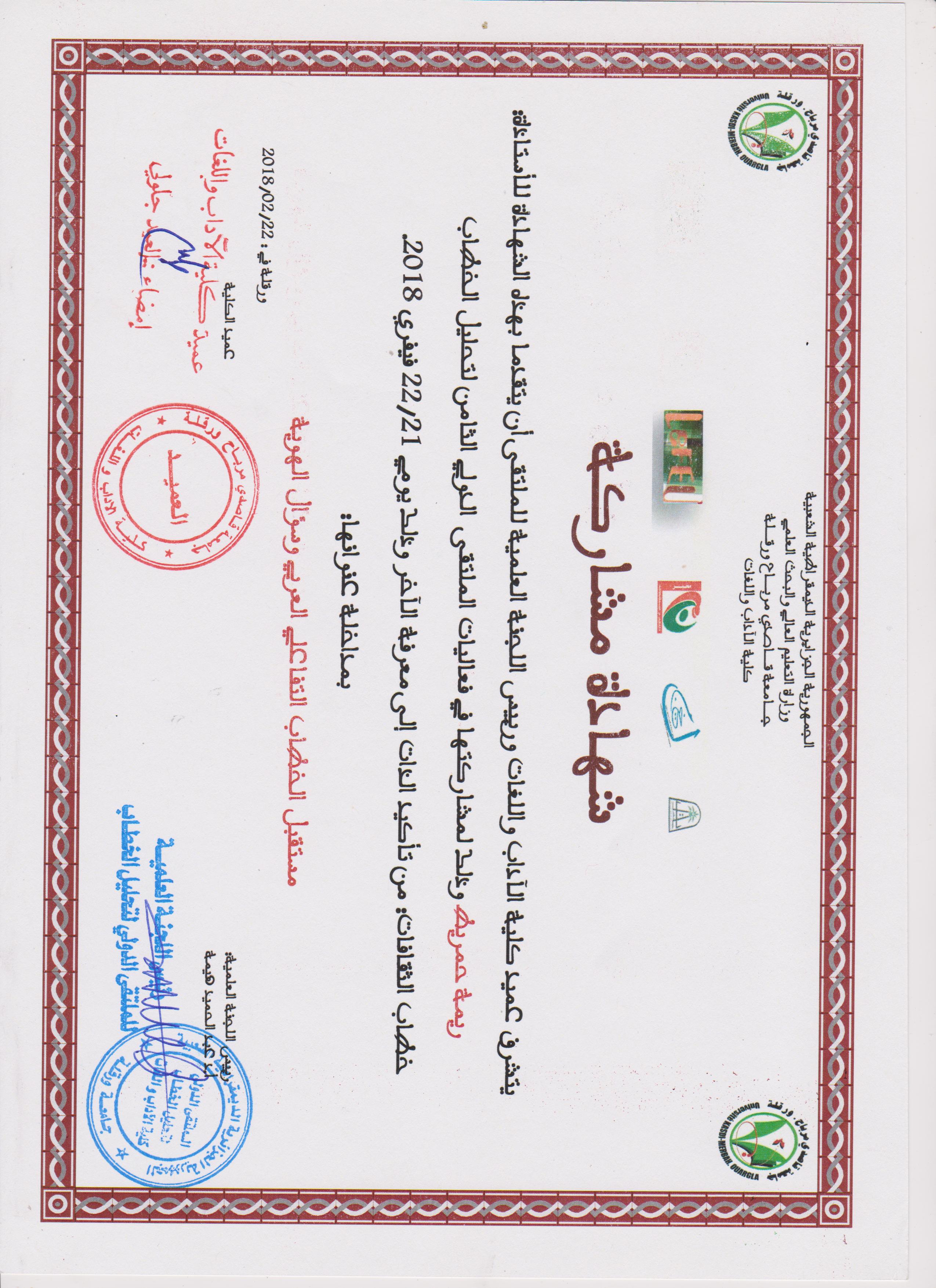 M. RIMA Hamrit, (2018-02-21), "مستقبل الخطاب التفاعلي العربي وسؤال الهوية", [international] خطاب الثقافات: من تأكيد الدات إلى معرفة الآخر , Université Kasdi Merbah Ouargla