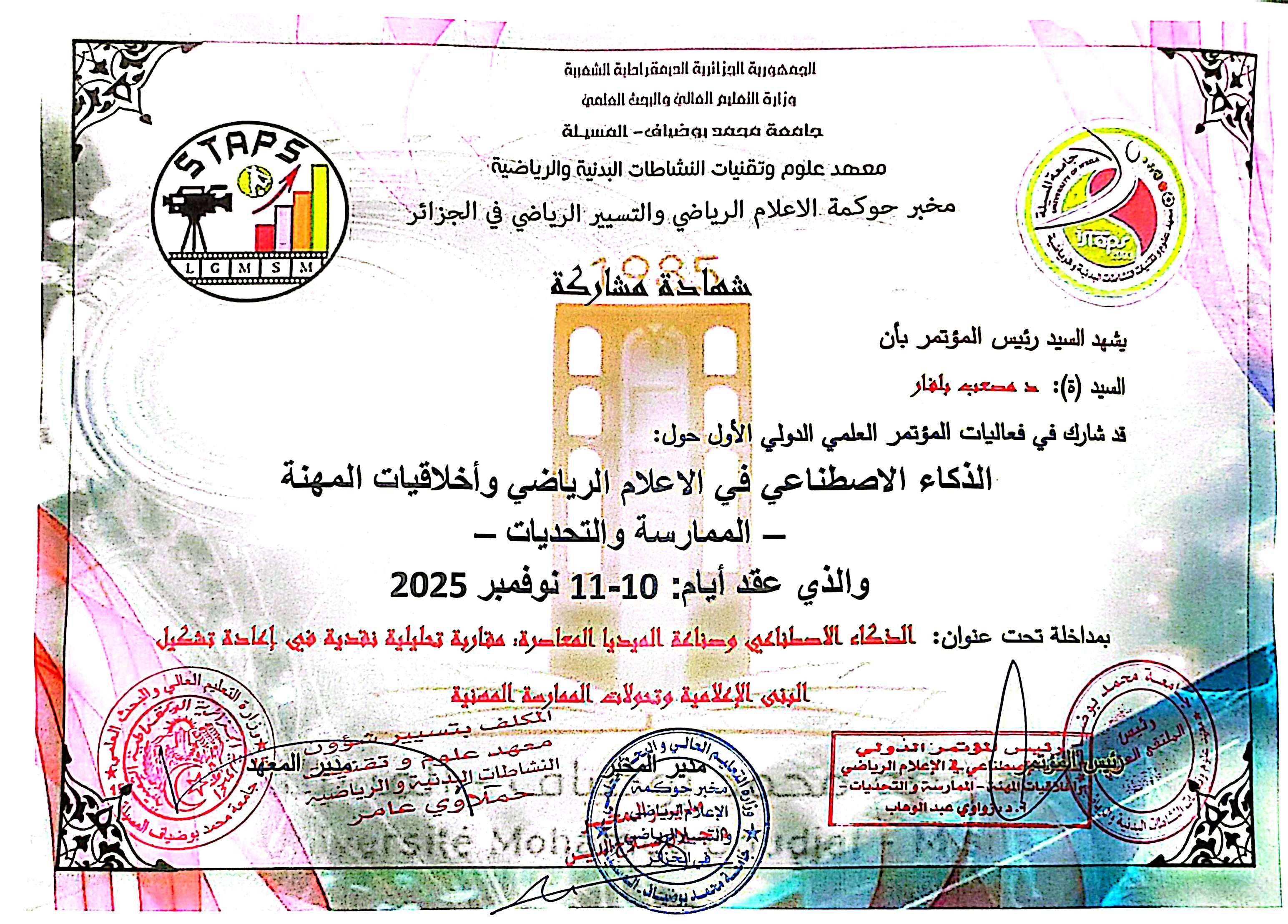 M. MOUSSAAB Belfar, (2025-11-10), "الذكاء الاصطناعي وصناعة الميديا المعاصرة: مقاربة تحليلية نقدية في إعادة تشكيل البنى الإعلامية وتحولات الممارسة المهنية AI-Driven Transformation in Contemporary Media A Critical Analysis of Institutional Restructuring and the Evolution of Professional Jou", [international] الذكاء الاصطناعي في الاعلام الرياضي واخلاقيات المهنة – الممارسة والتحديات , جامعة محمد بوضياف / المسيلة