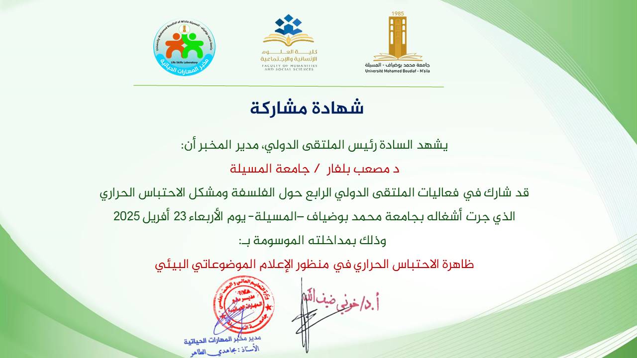 M. MOUSSAAB Belfar, (2025-04-23), "ظاهرة الاحتباس الحراري في منظور الاعلام الموضوعاتي البيئي", [international] الفلسفة ومشكلة الاحتباس الحراري , جامعة محمد بوضياف / المسيلة