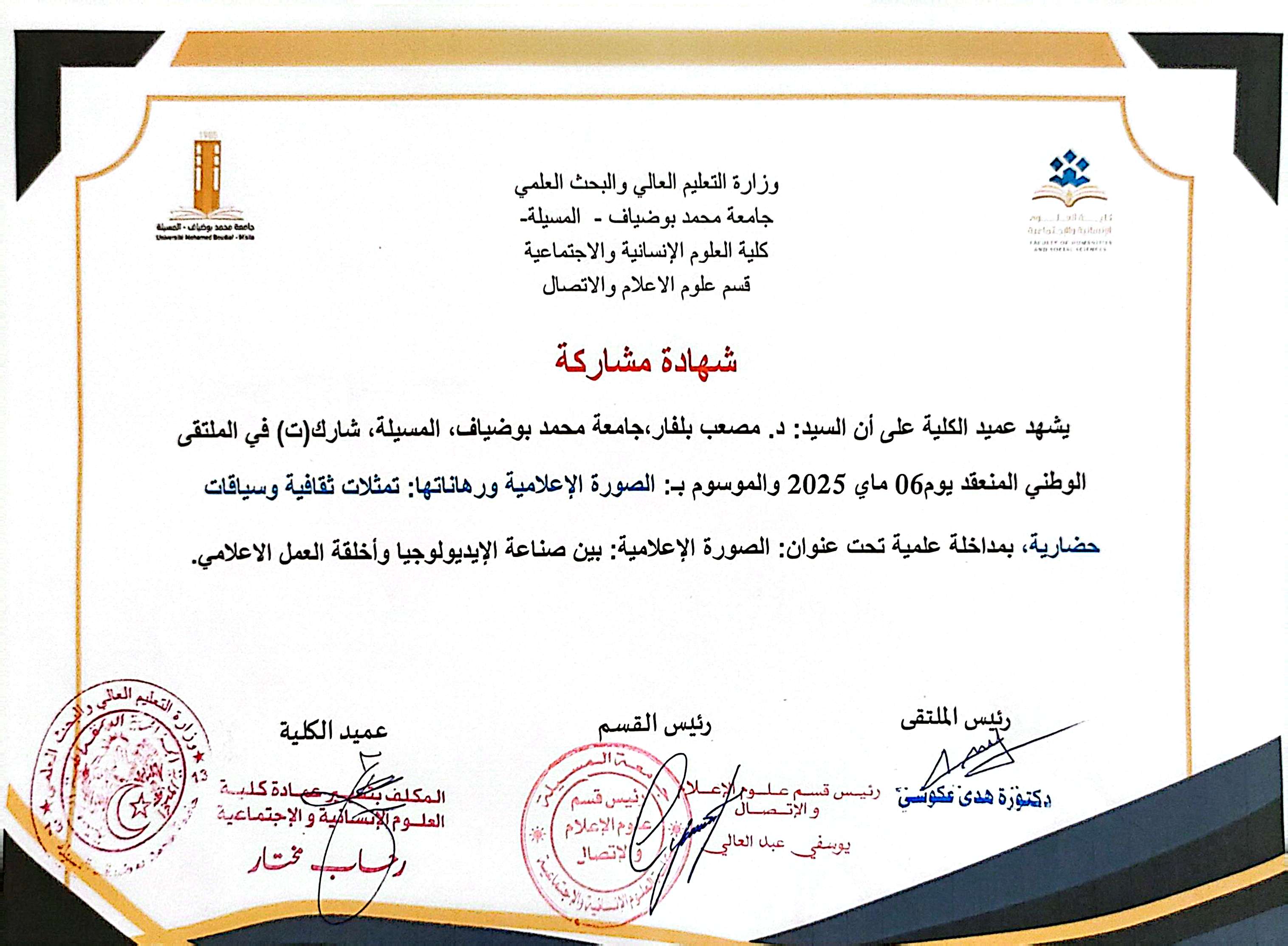 M. MOUSSAAB Belfar, (2025-05-06), "الصورة الاعلامية: بين صناعة الأيديولوجيا وأخلقة العمل الاعلامي", [national] الصورة الإعلامية ورهاناتها : تمثلات ثقافية وسياقات حضارية , جامعة محمد بوضياف / المسيلة